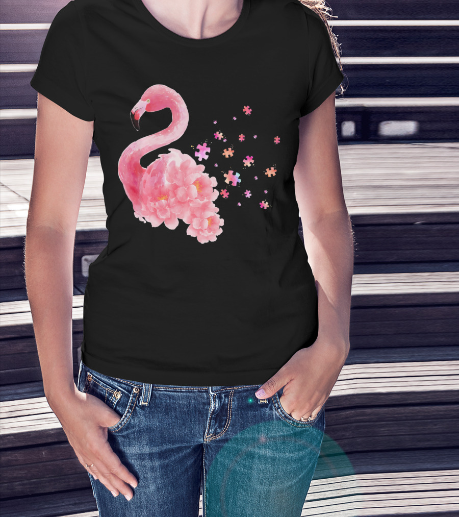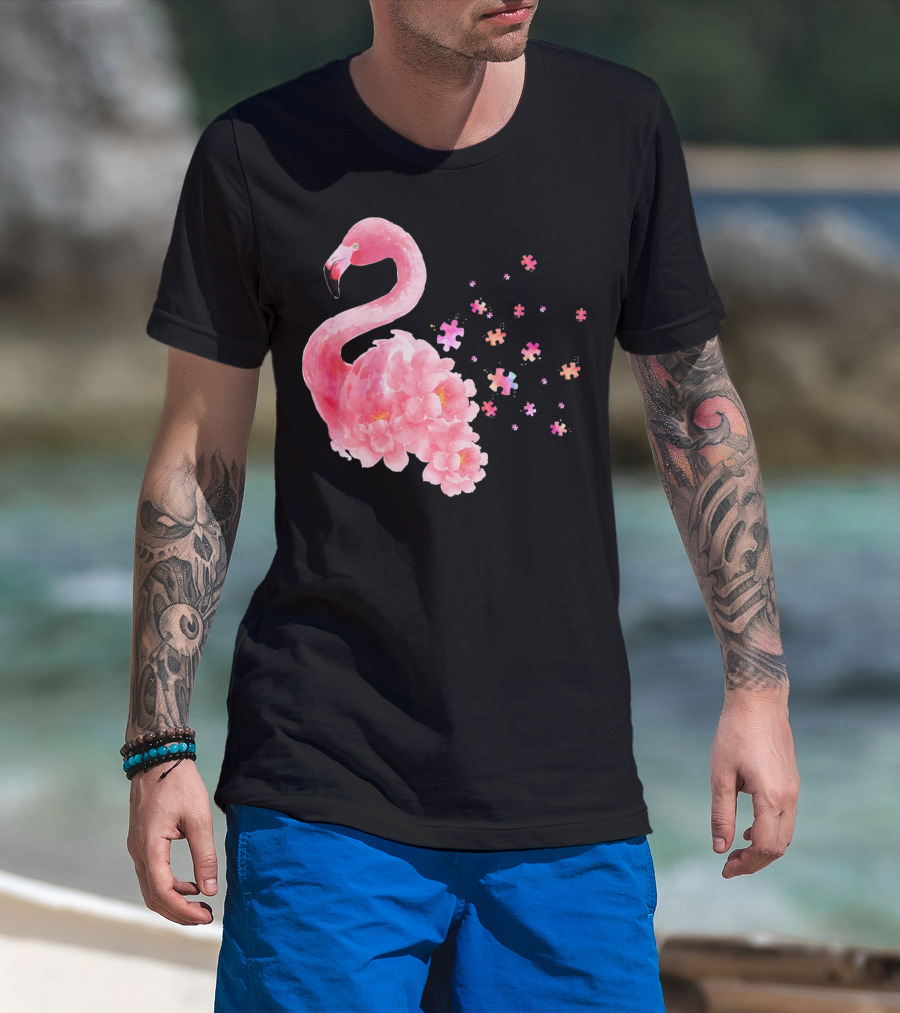 Flamingo Puzzle Autism Awareness Floral Elements T-Shirt