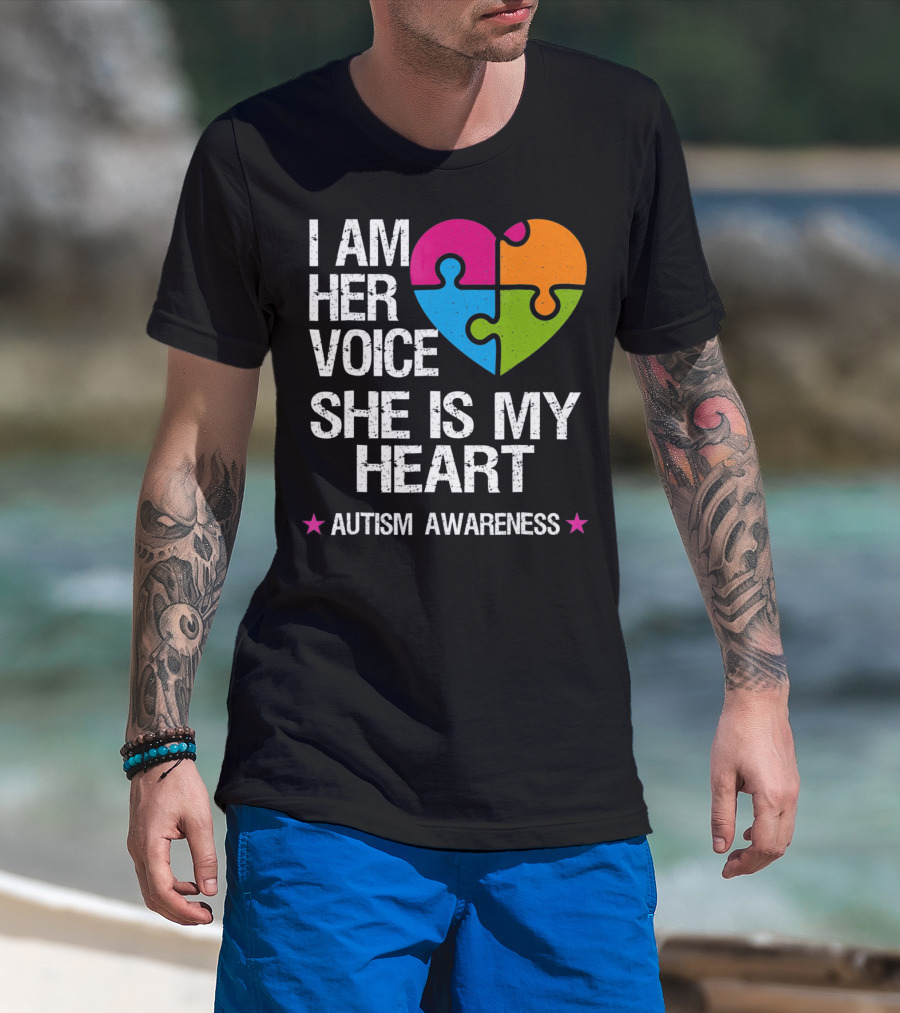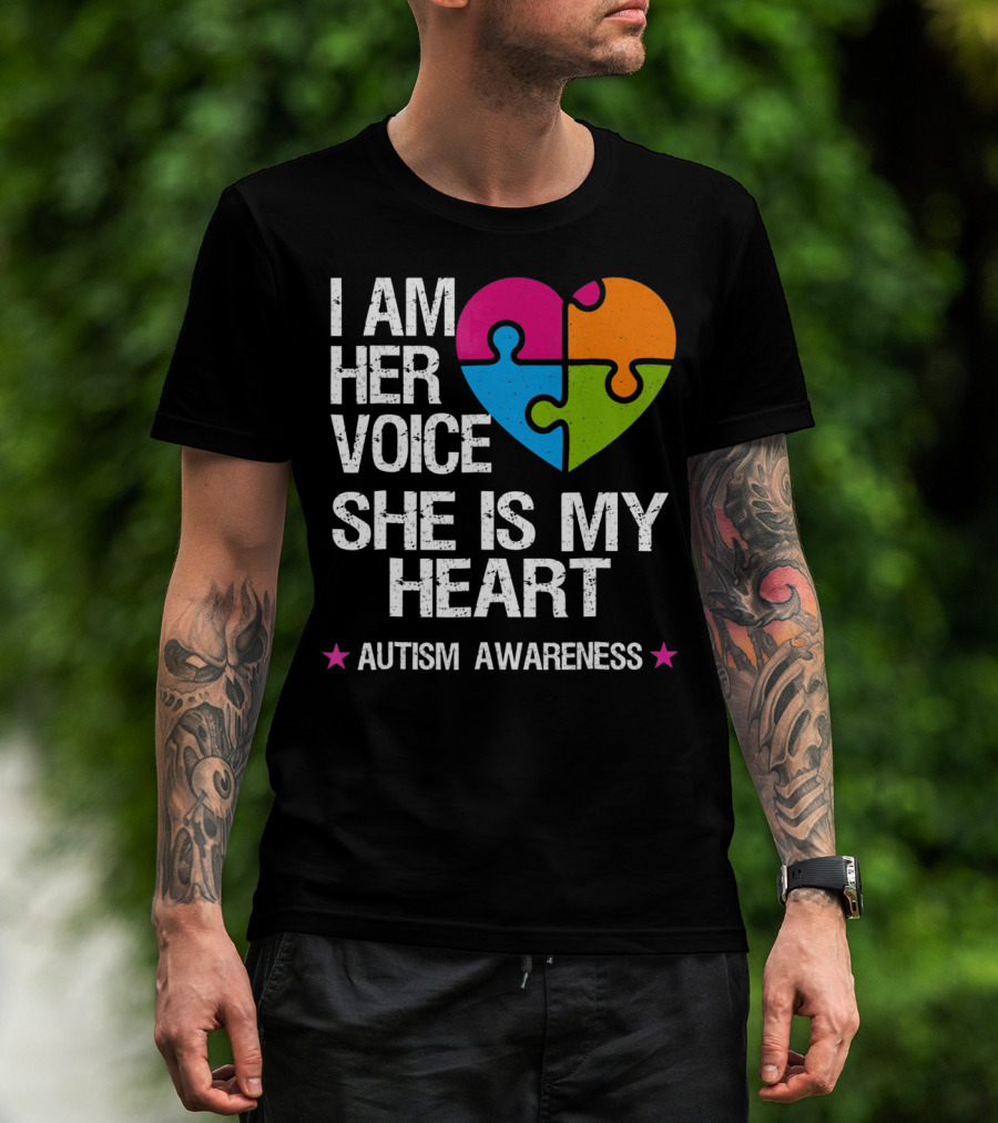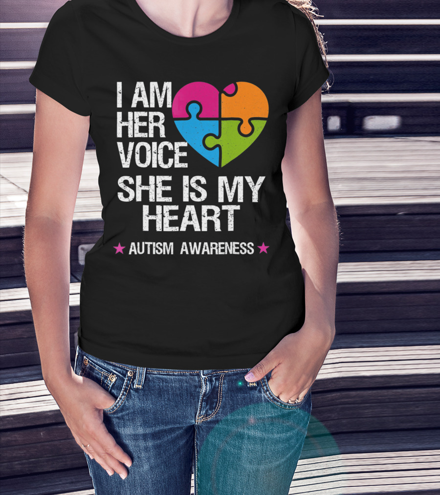 I Am Her Voice She Is My Heart Autism Awareness Puzzle Heart T-Shirt