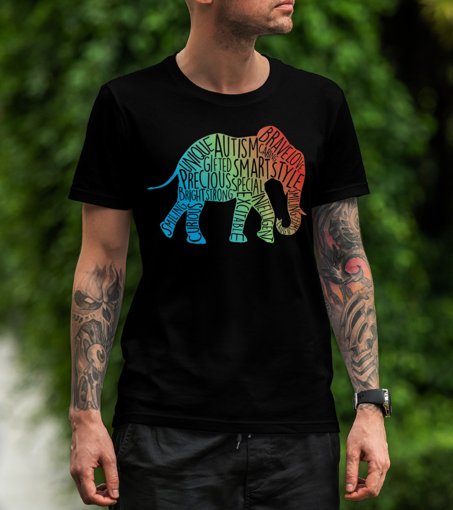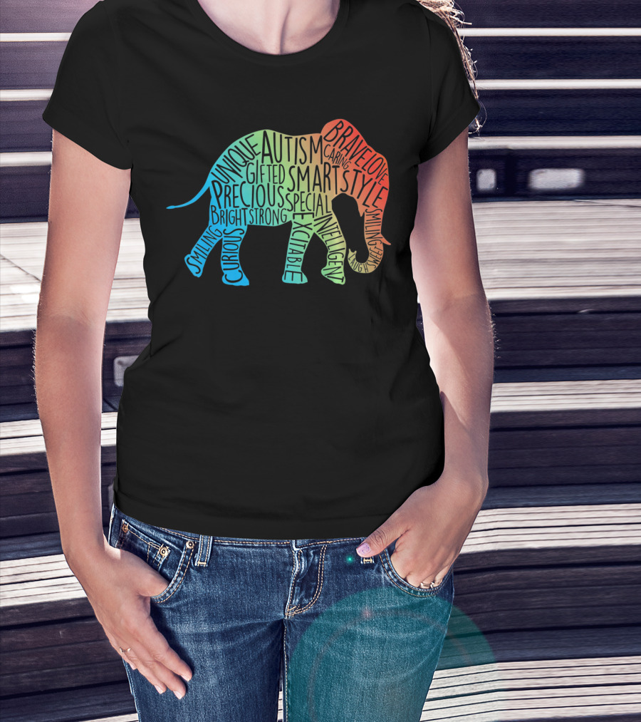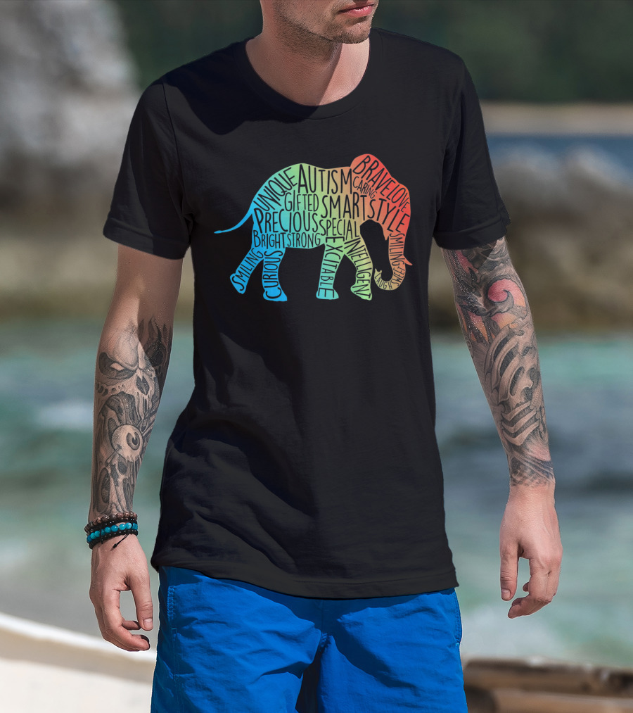 The Autism Awareness Elephant Collage Brave Unique Precious Bright Smart Strong T-shirt is designed for everyday wear and a consistent fit. Fabric is pre-shrunk ring-spun cotton with durable stitching. See the size chart below for exact measurements.