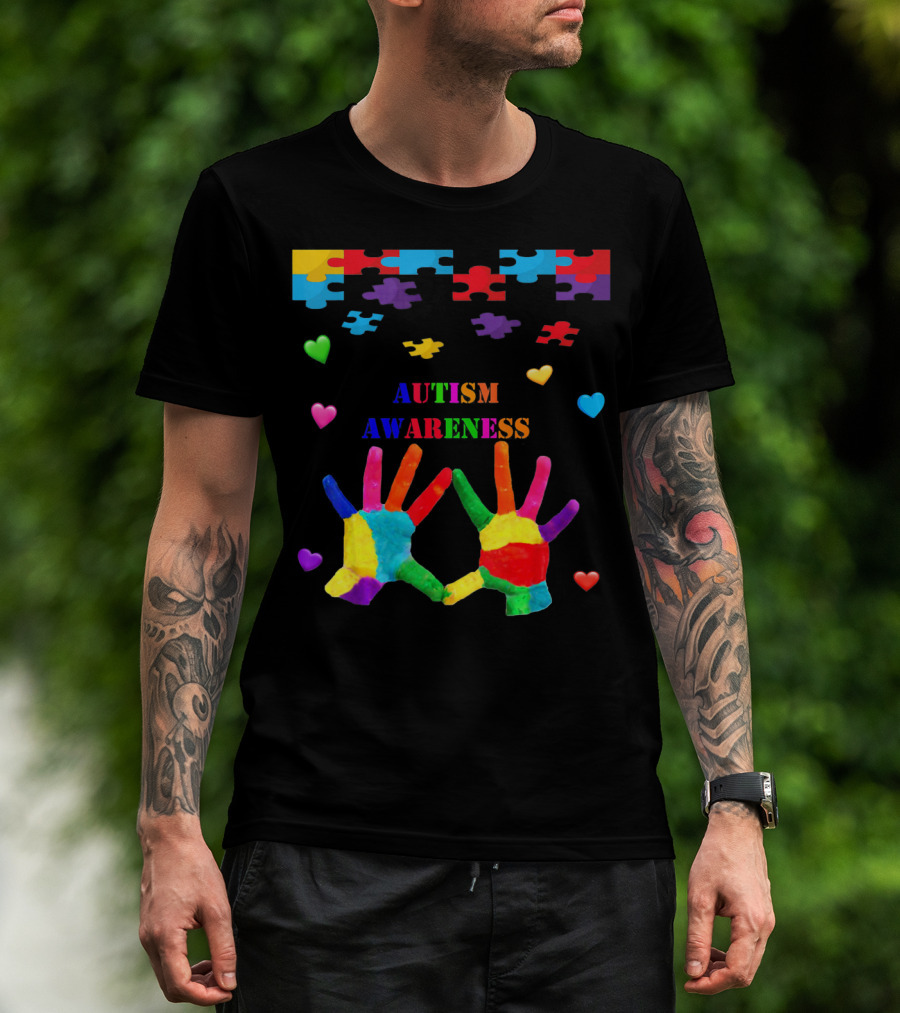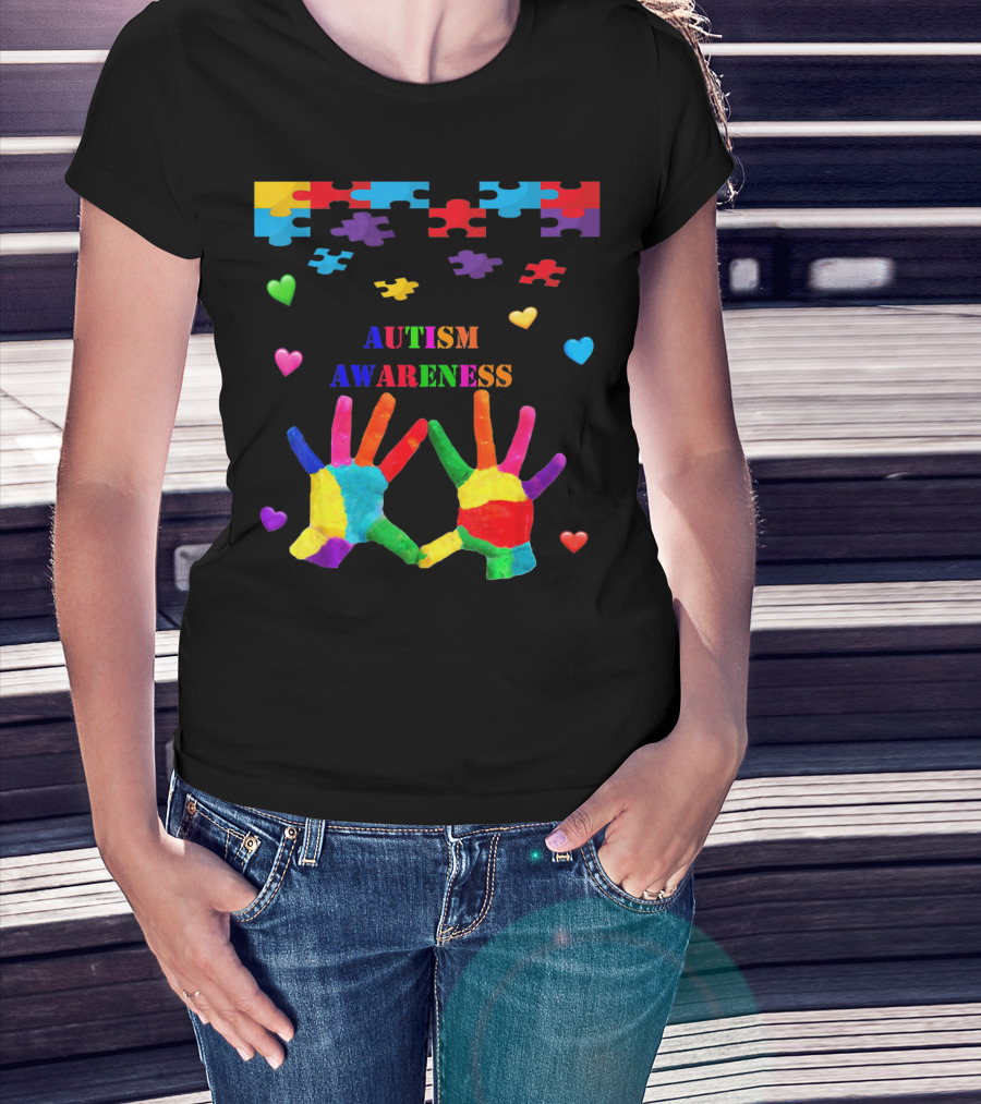 Autism Awareness Colorful Hands With Puzzle Pieces And Hearts T-Shirt