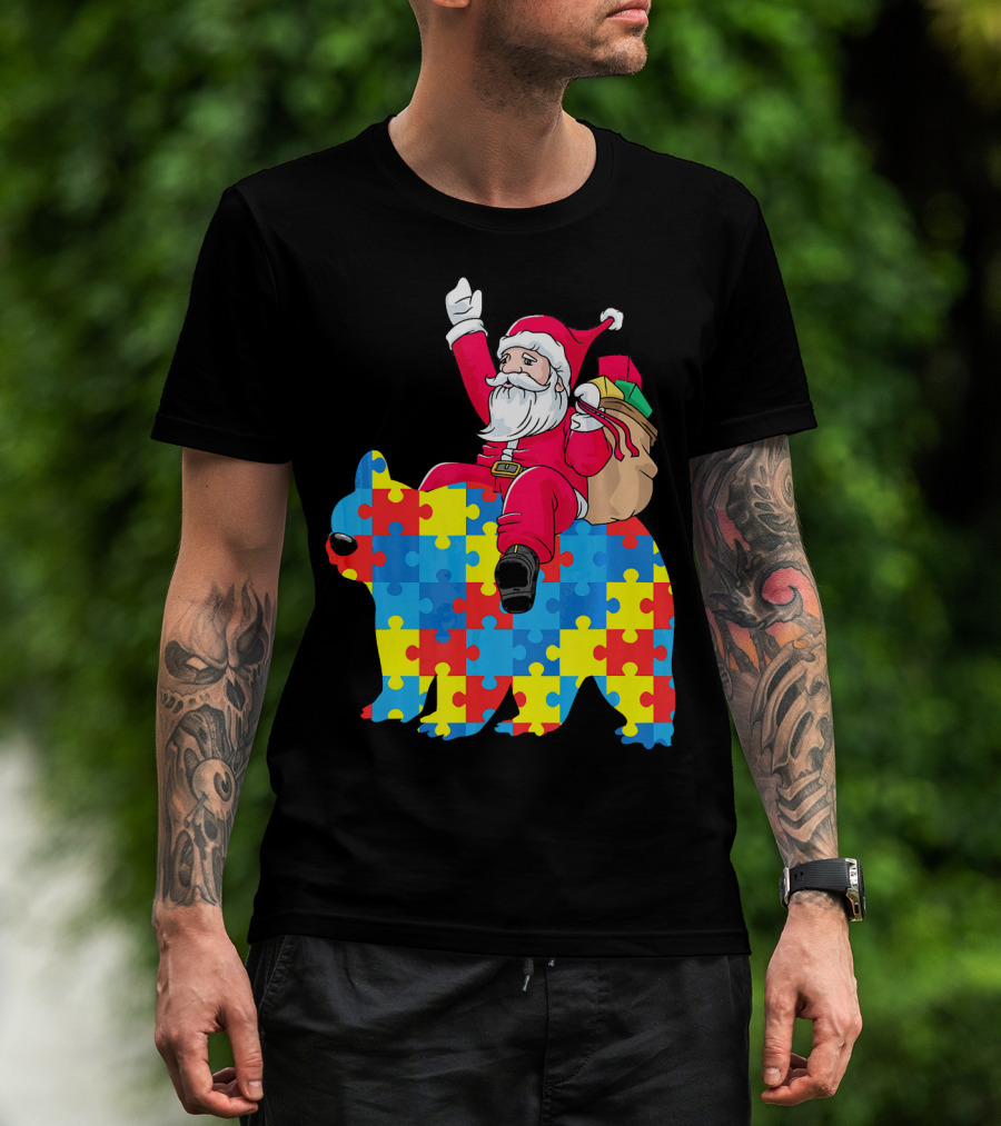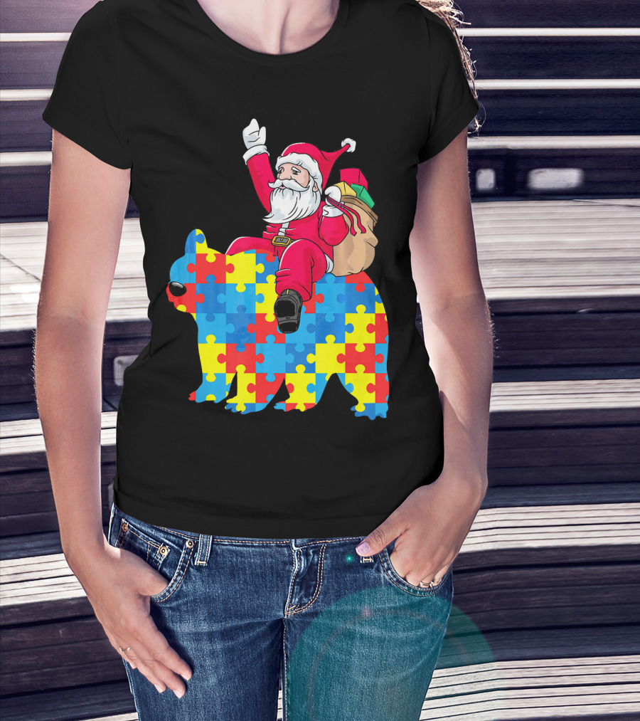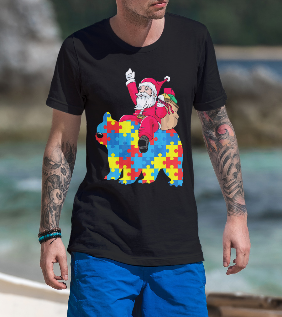 Santa Claus Riding Puzzle Piece Bear Autism Awareness T-Shirt