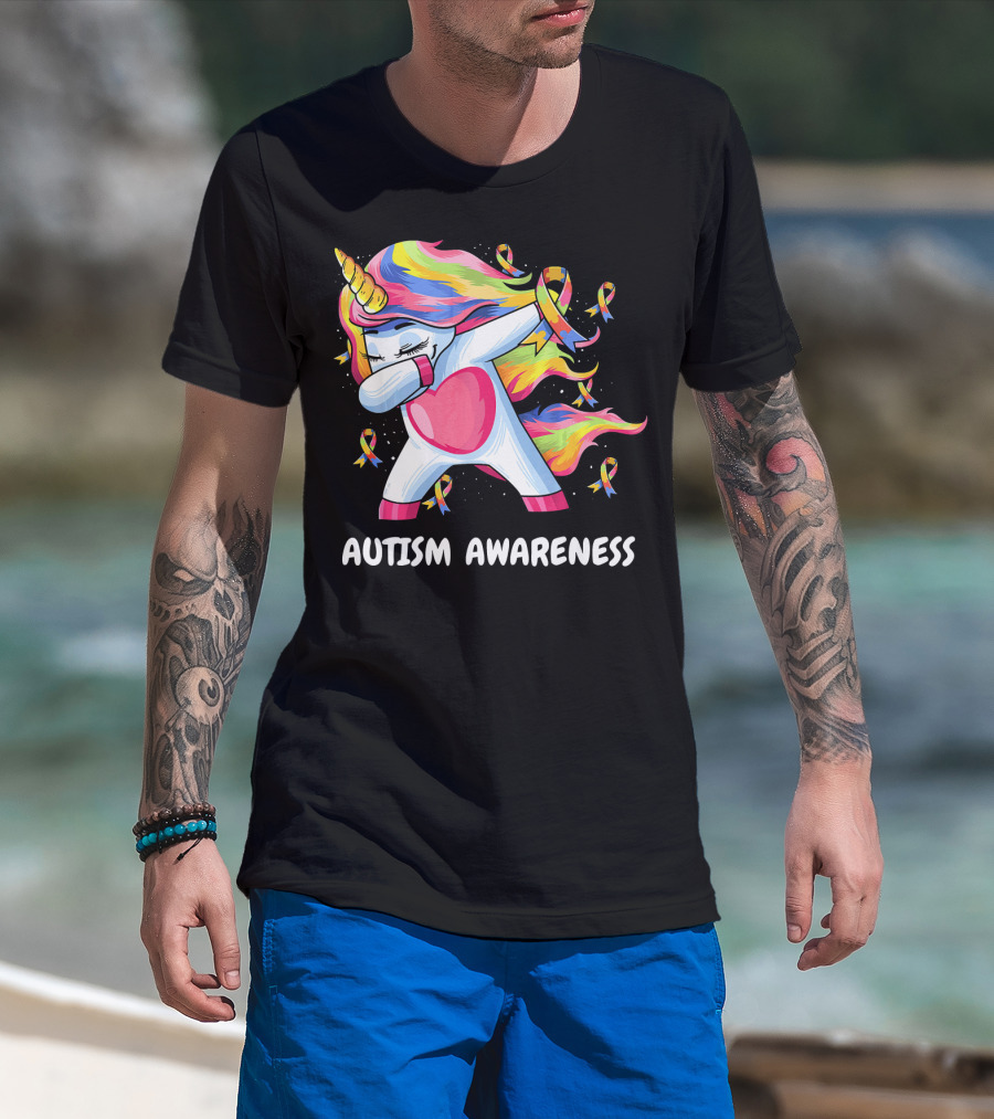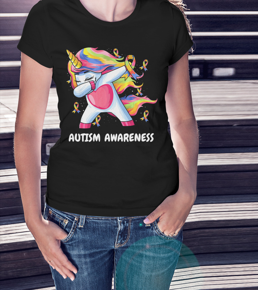 Autism Awareness Dabbing Rainbow Unicorn With Puzzle T-Shirt