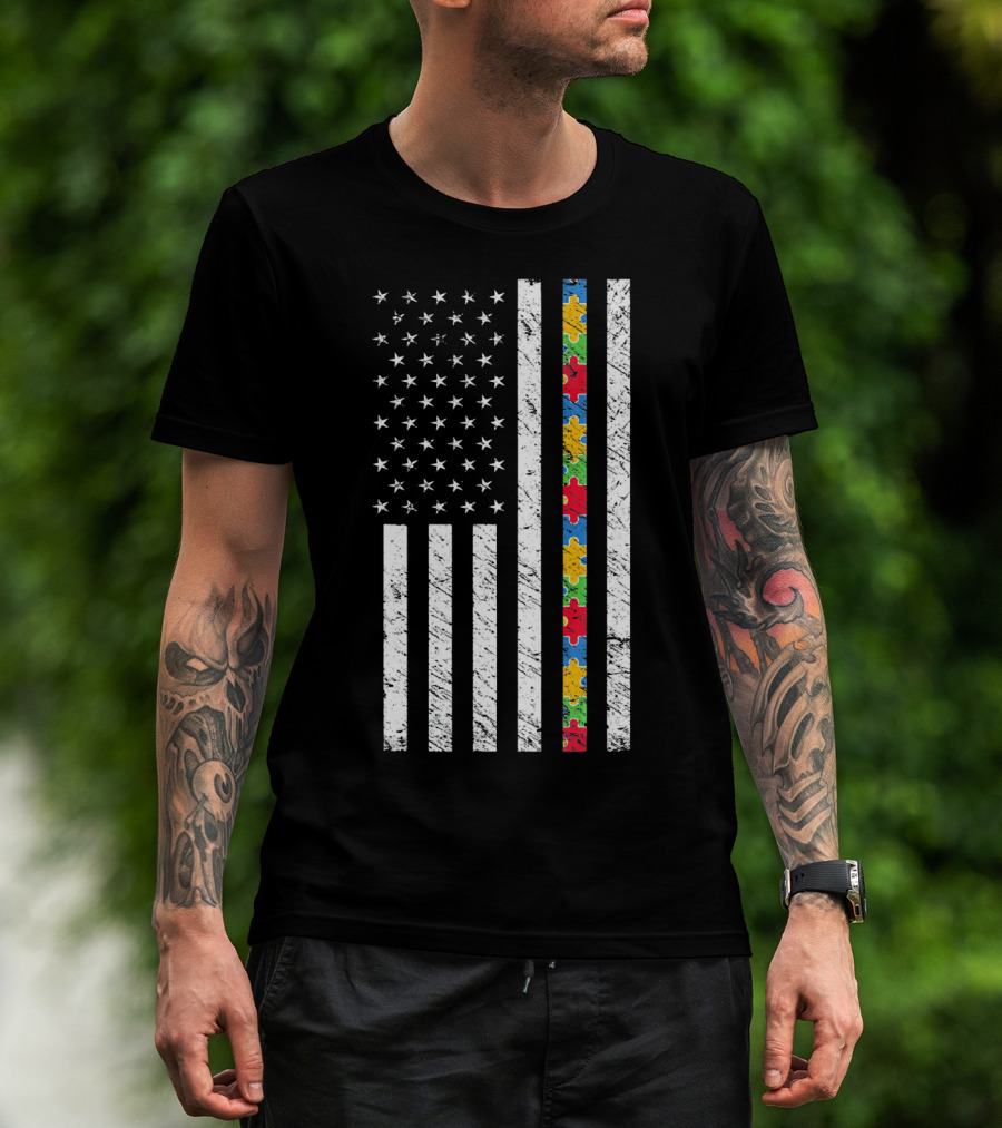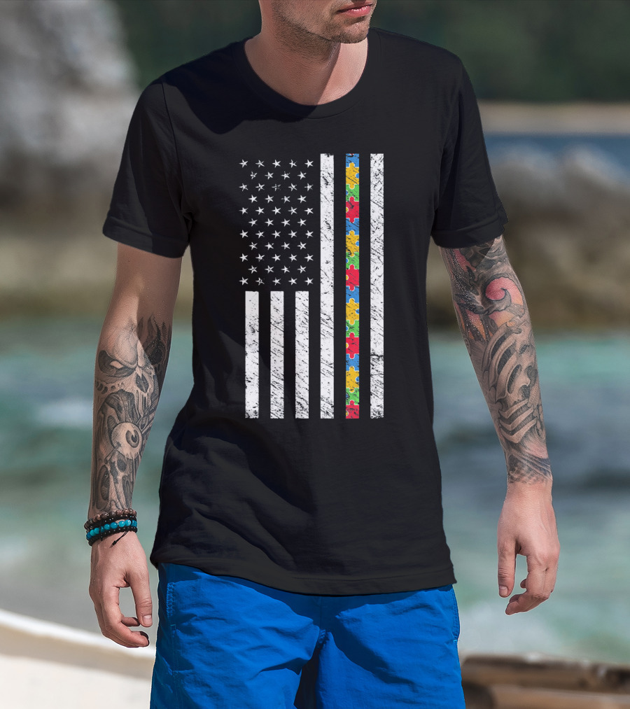 Autism Awareness American Flag Puzzle Piece T-Shirt