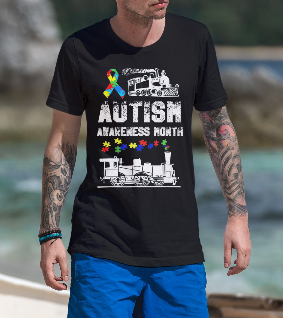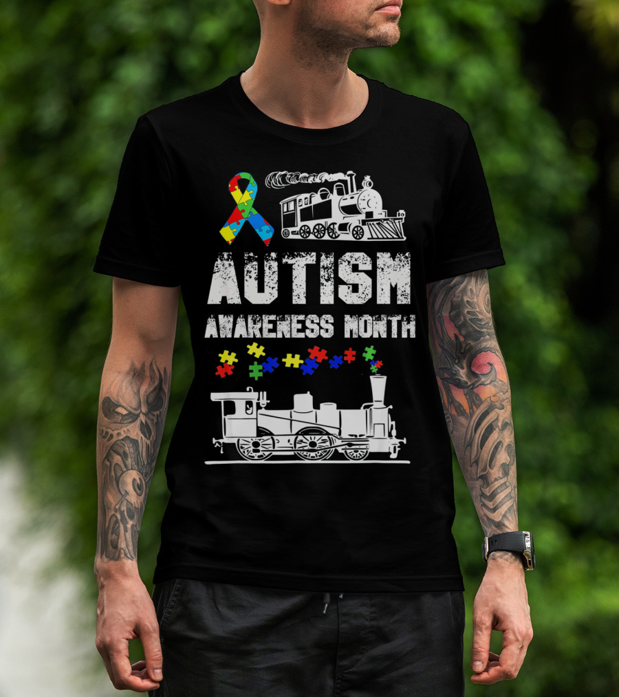 Autism Awareness Month Puzzle Ribbon Steam Train T-Shirt