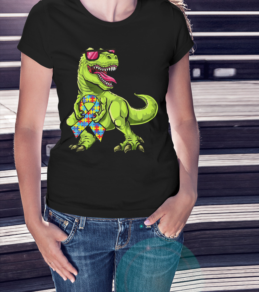 Dinosaur Rex With Autism Awareness Puzzle Ribbon And Sunglasses T-Shirt