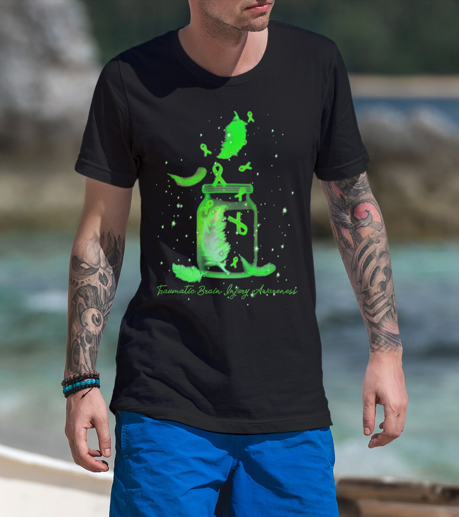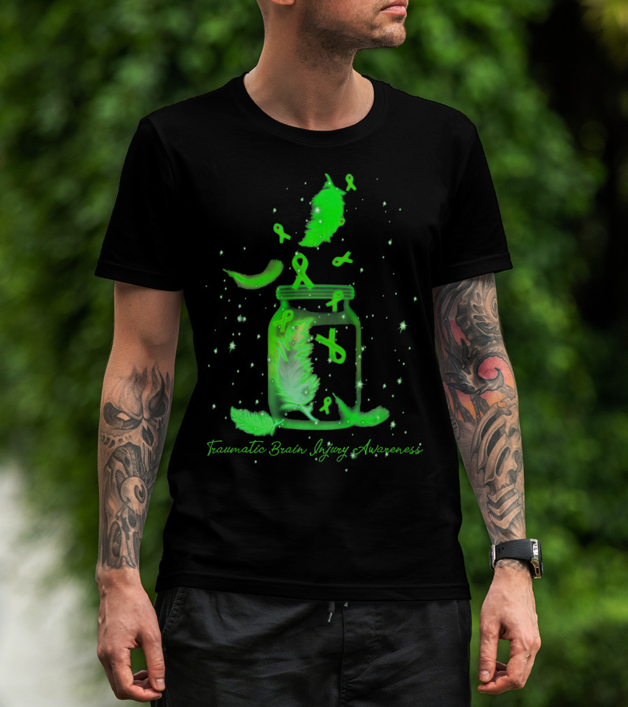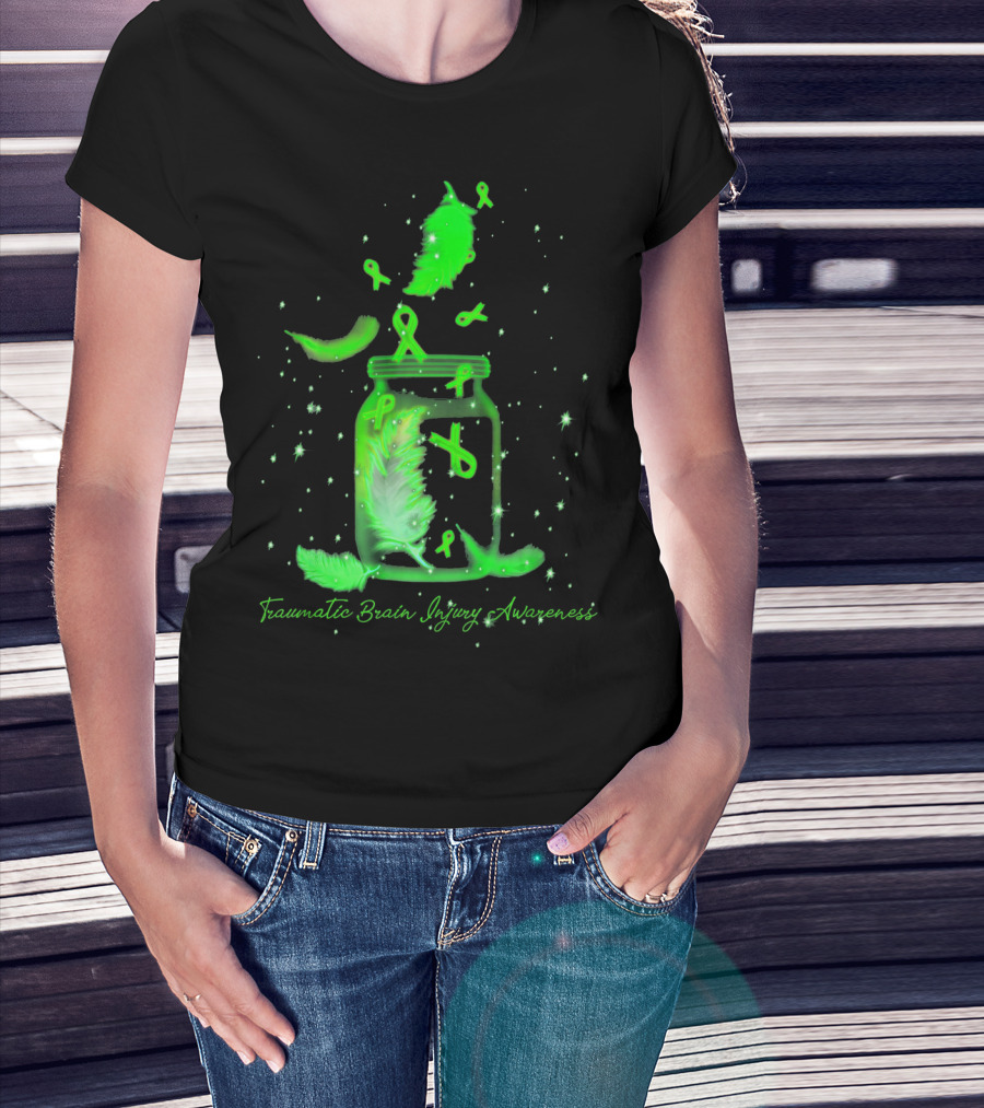 Traumatic Brain Injury Awareness Dream Jar With Green Ribbons And Feathers T-Shirt