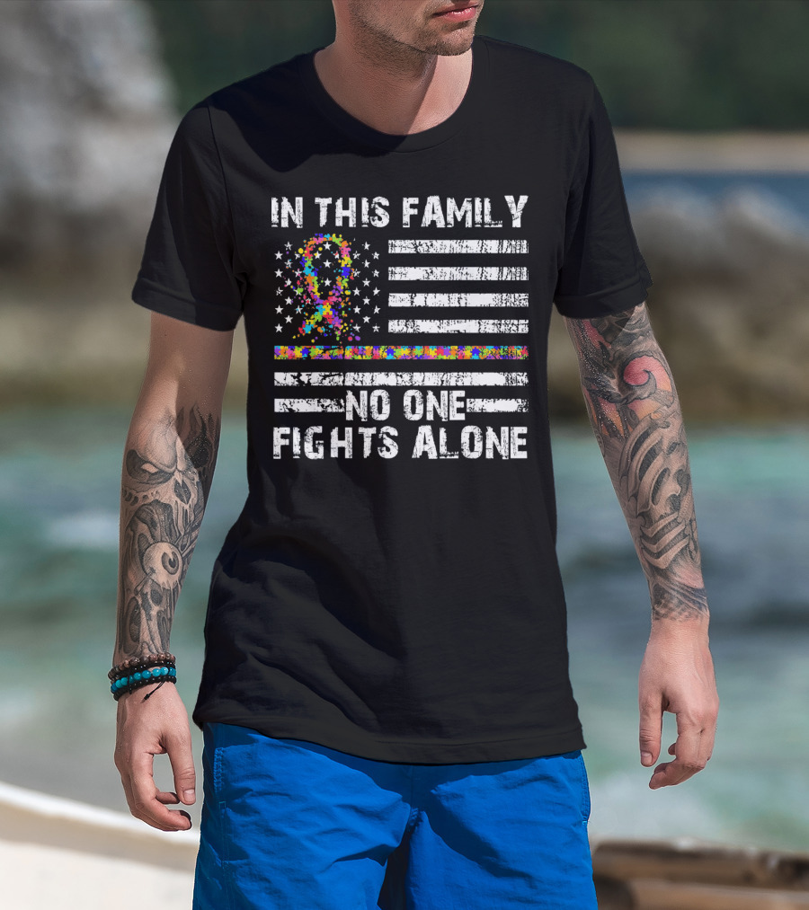 In This Family No One Fights Alone Autism Awareness Puzzle Ribbon Flag T-Shirt