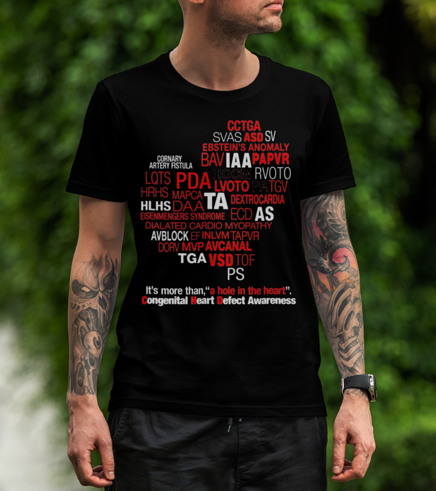 The Congenital Heart Defect Awareness CCTGA Ebstein's Anomaly Dextrocardia Eisenmenger's Syndrome Dilated Cardiomyopathy VSD It's More Than a Hole in the Heart T-shirt is designed for everyday wear and a consistent fit. Fabric is pre-shrunk ring-spun cotton with durable stitching. See the size chart below for exact measurements.