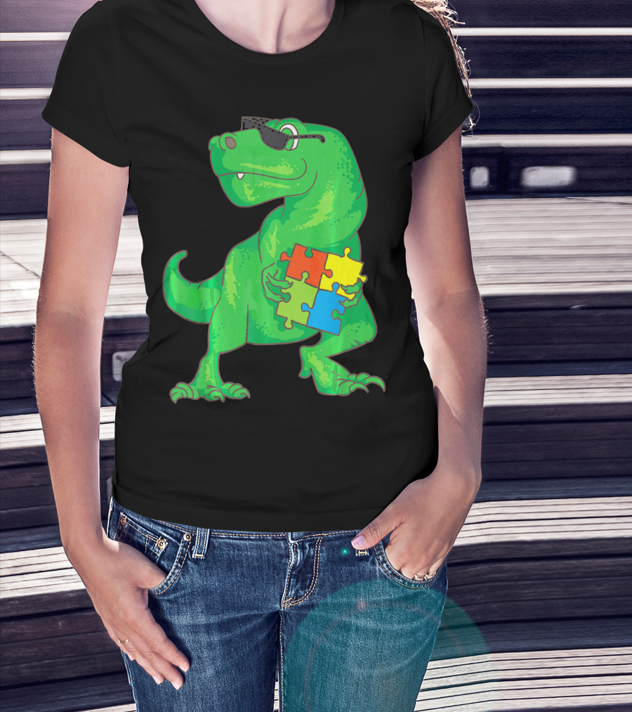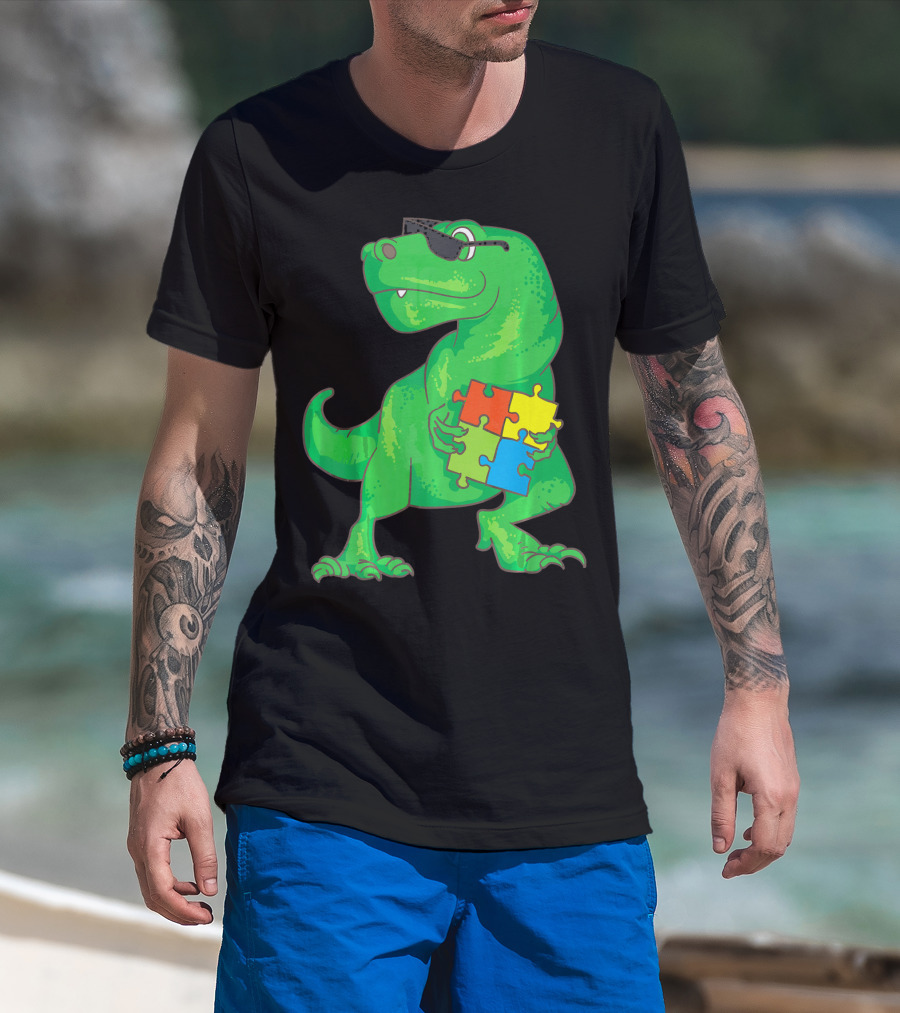 Autism Awareness Month Dinosaur Holding Puzzle Pieces T-Shirt