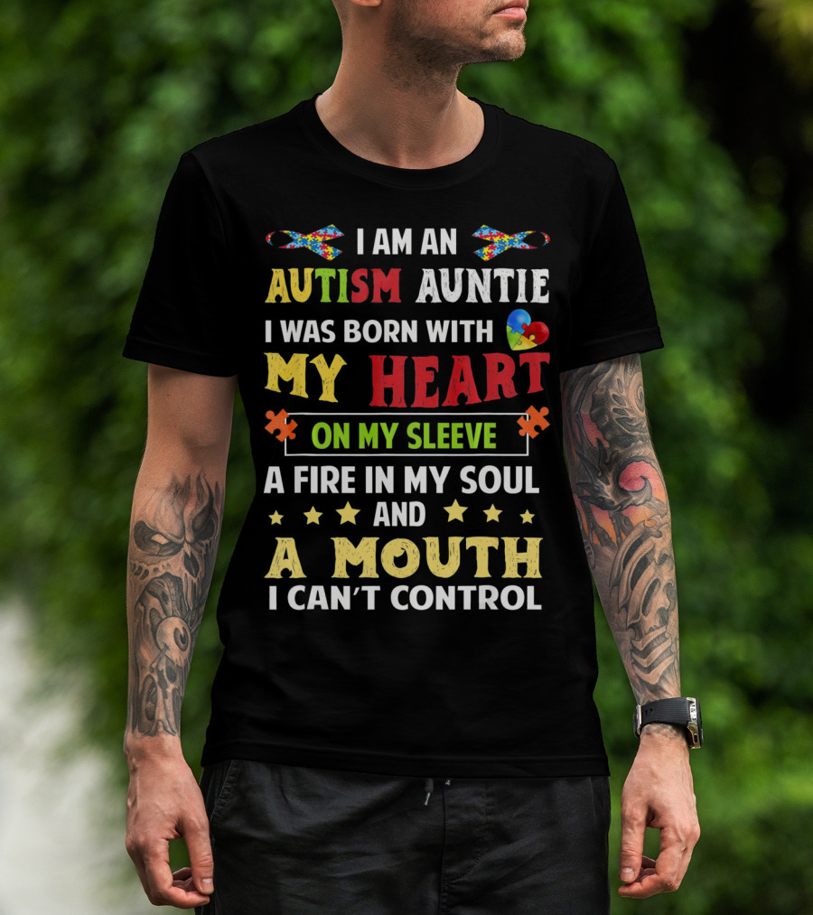 I Am An Autism Auntie Born With My Heart On My Sleeve A Fire In My Soul And A Mouth I Can't Control T-Shirt