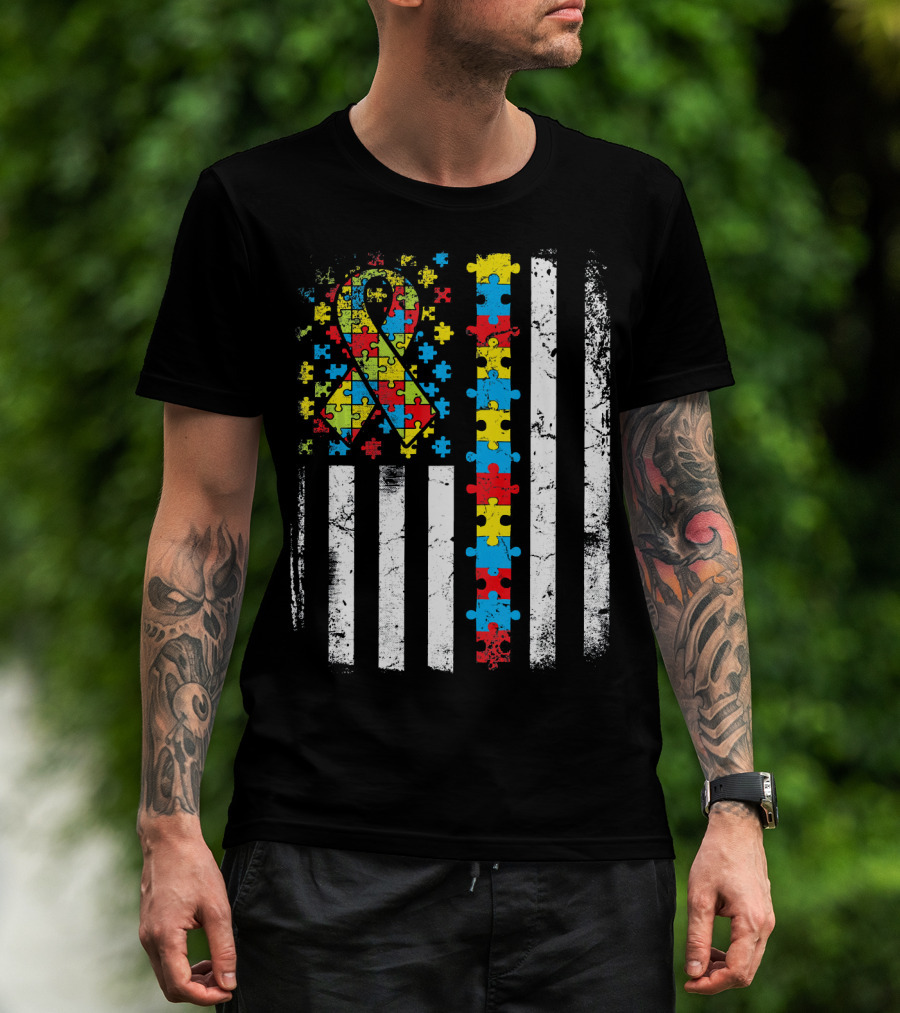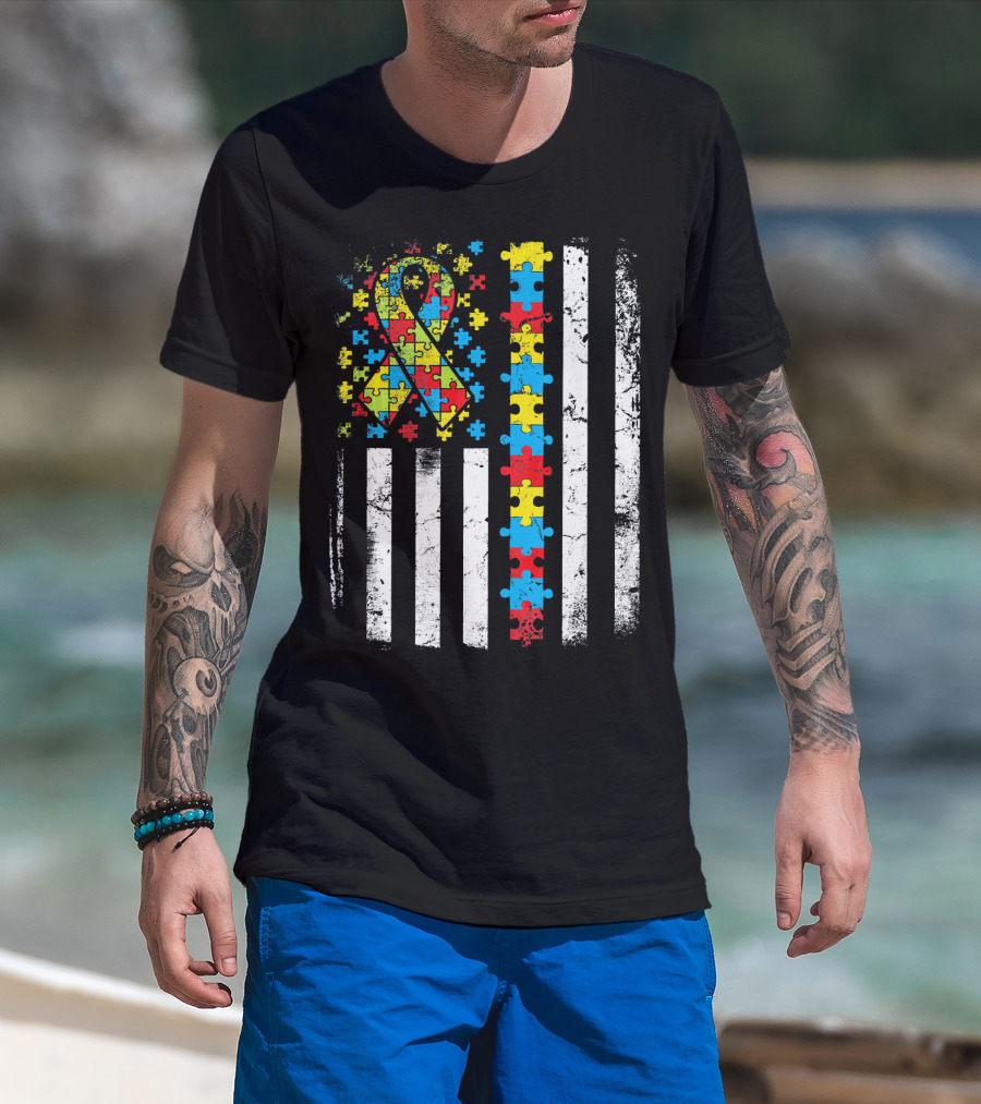 The Autism Awareness American Flag Puzzle T-shirt is designed for everyday wear and a consistent fit. Fabric is pre-shrunk ring-spun cotton with durable stitching. See the size chart below for exact measurements.