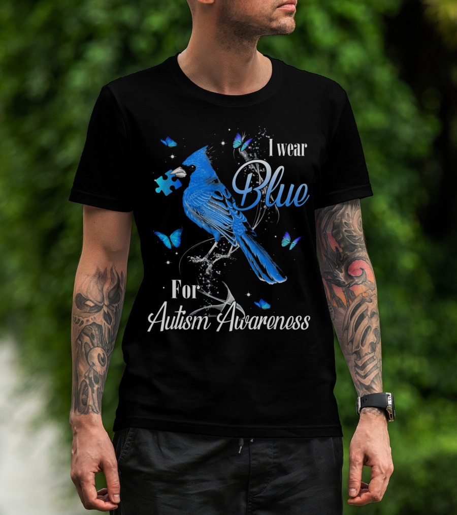 The I Wear Blue For Autism Awareness Cardinal Bird Puzzle Piece Butterfly T-shirt is designed for everyday wear and a consistent fit. Fabric is pre-shrunk ring-spun cotton with durable stitching. See the size chart below for exact measurements.