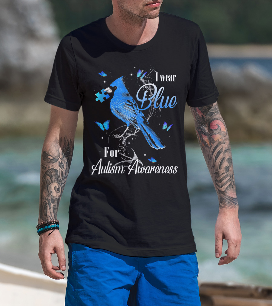 I Wear Blue For Autism Awareness Cardinal Bird Puzzle Piece Butterfly T-Shirt