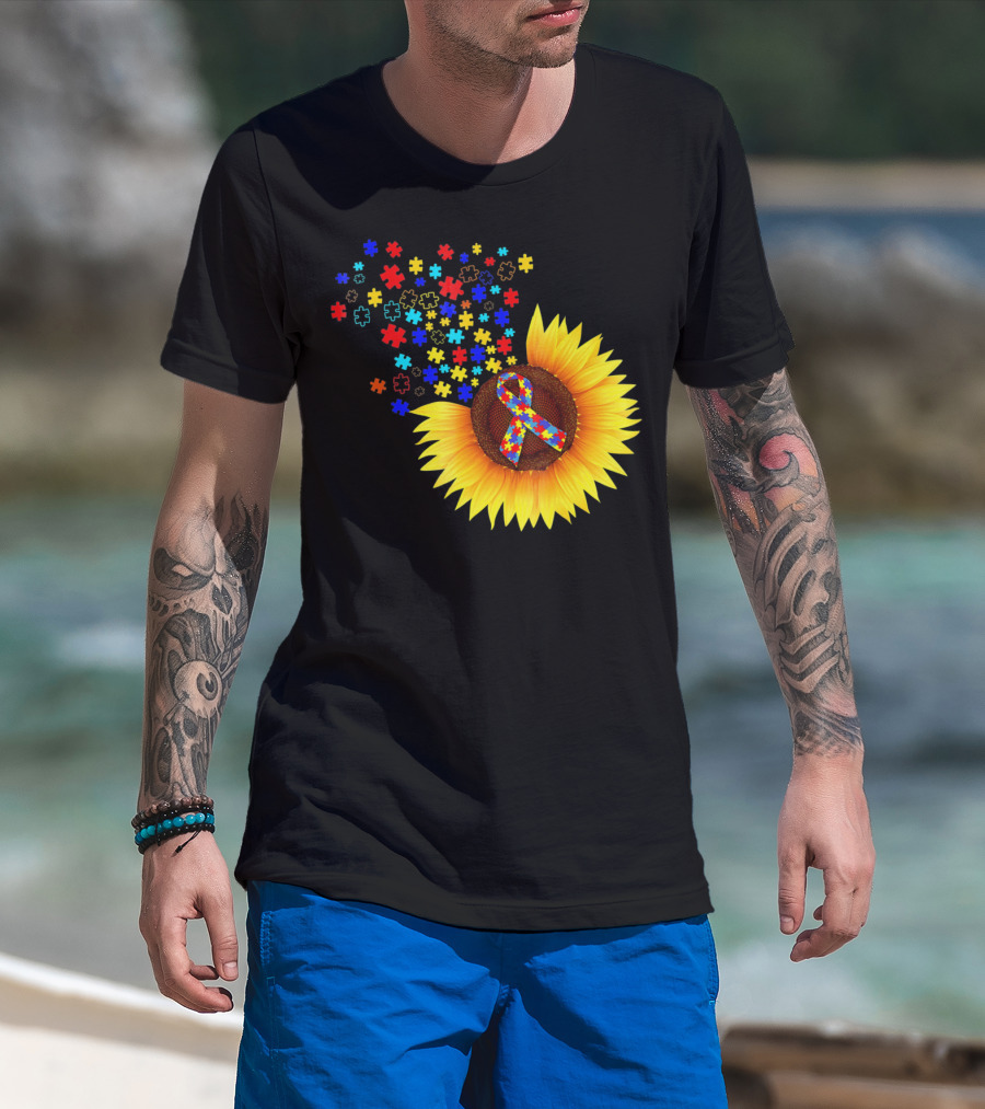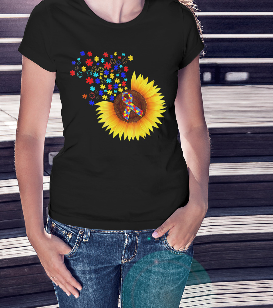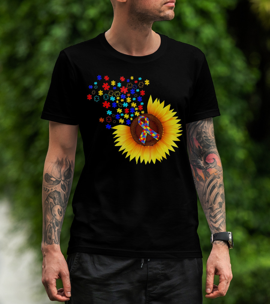 Sunflower Autism Awareness Ribbon With Colorful Puzzle Pieces T-Shirt