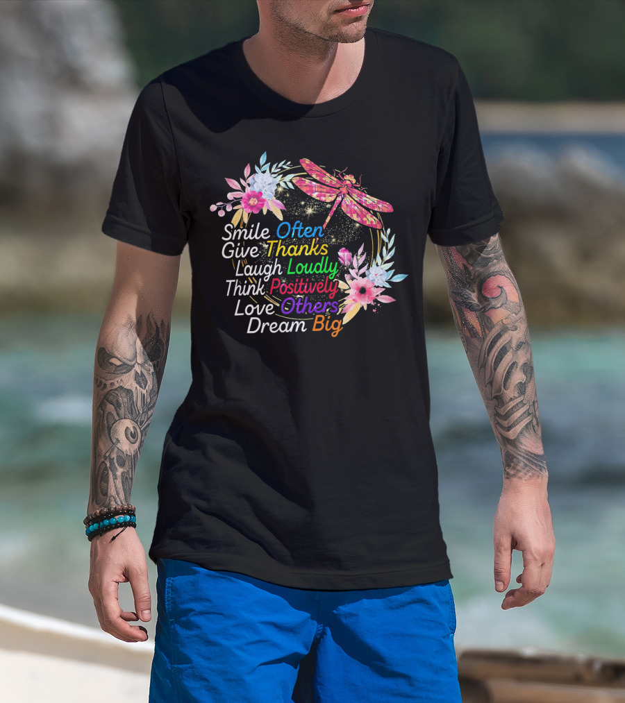 Smile Often Give Thanks Laugh Loudly Think Positively Love Others Dream Big Dragonfly Floral Wreath T-Shirt