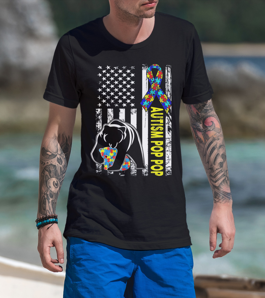 Autism Pop Pop American Flag Bear Puzzle T-Shirt