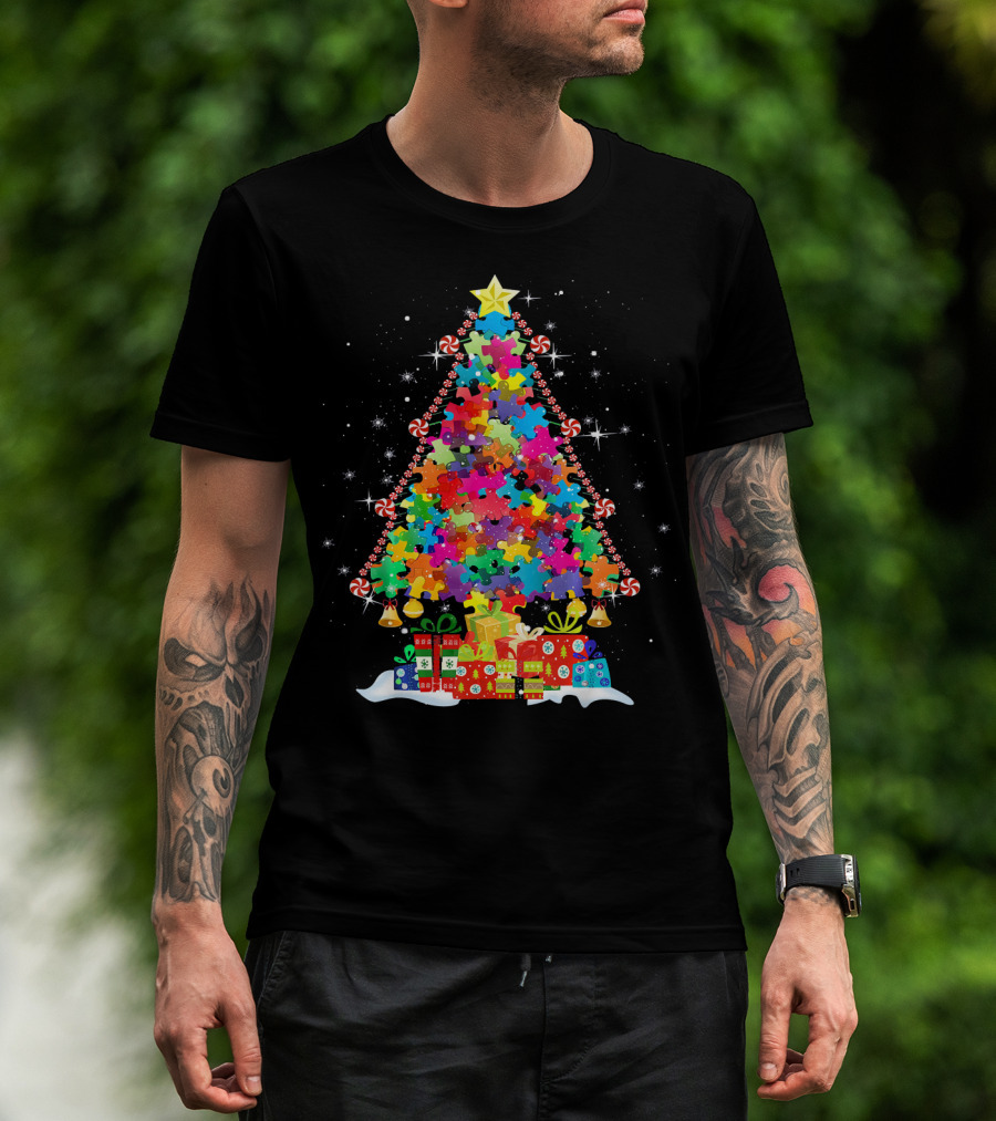 Autism Awareness Puzzle Pieces Christmas Tree With Star And Presents T-Shirt