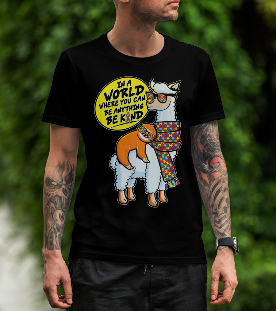 In A World Where You Can Be Anything Be Kind Autism Awareness Sloth Riding Llama T-Shirt