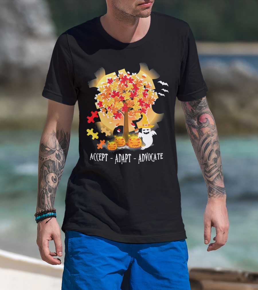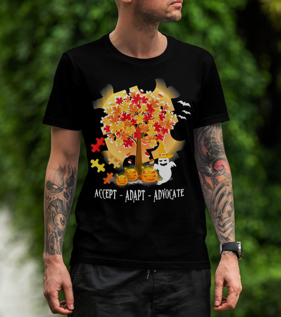 Accept Adapt Advocate Halloween Autism Awareness Ghost Pumpkin Puzzle Bats T-Shirt