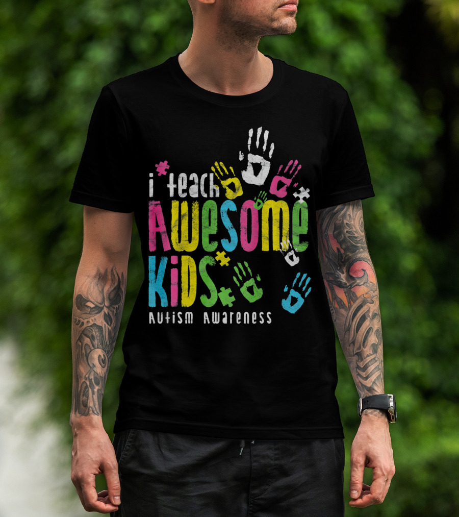 I Teach Awesome Kids Autism Awareness Colorful Handprints T-Shirt