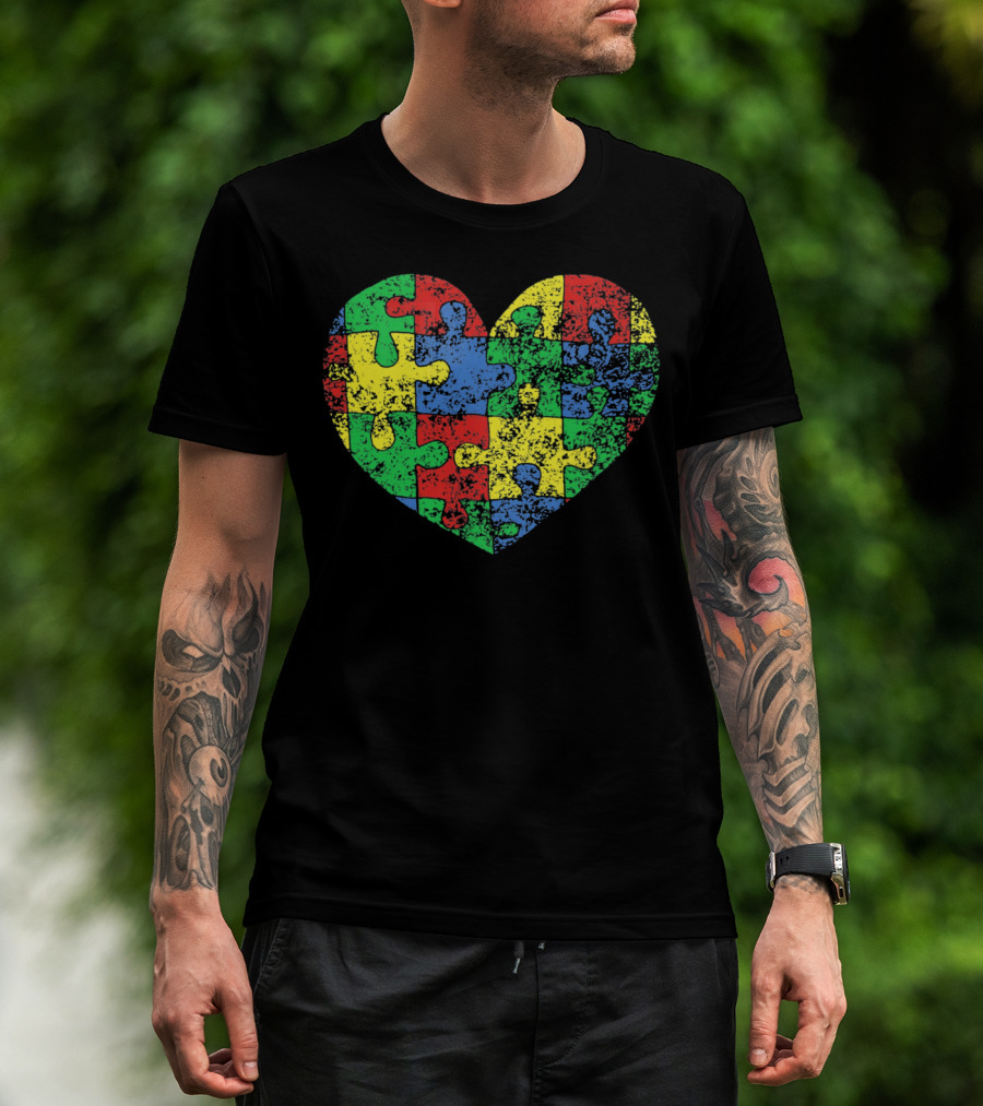 The Distressed Heart Puzzle Autism T-shirt is designed for everyday wear and a consistent fit. Fabric is pre-shrunk ring-spun cotton with durable stitching. See the size chart below for exact measurements.