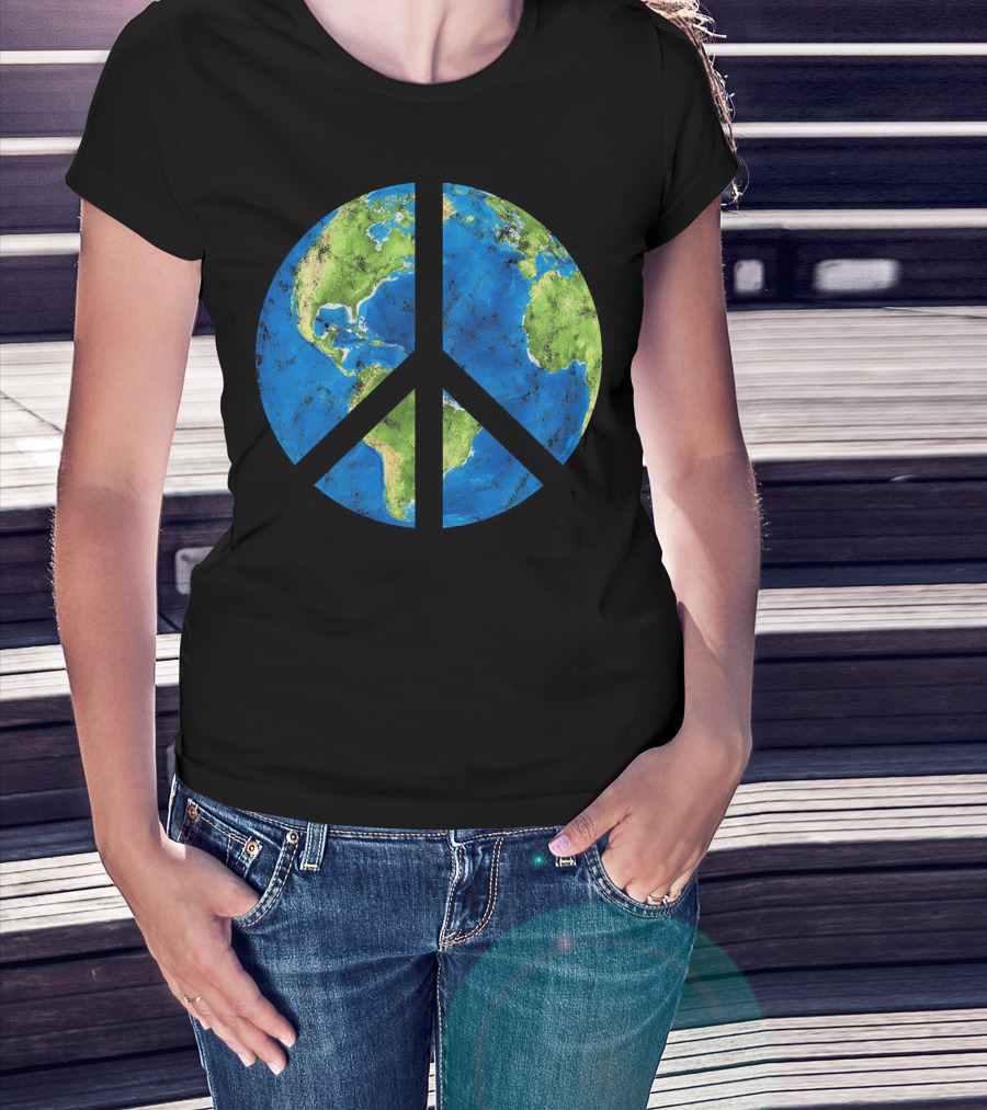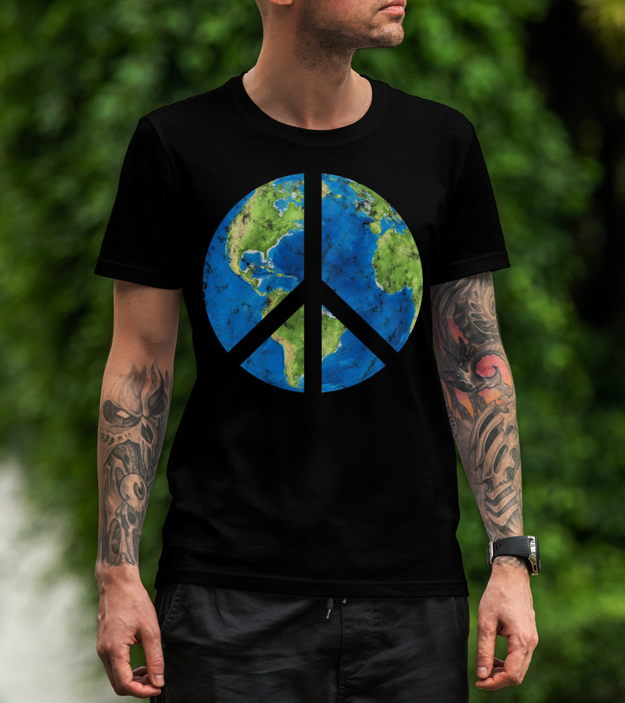 The Peace On Earth Globe Peace Sign T-shirt is designed for everyday wear and a consistent fit. Fabric is pre-shrunk ring-spun cotton with durable stitching. See the size chart below for exact measurements.