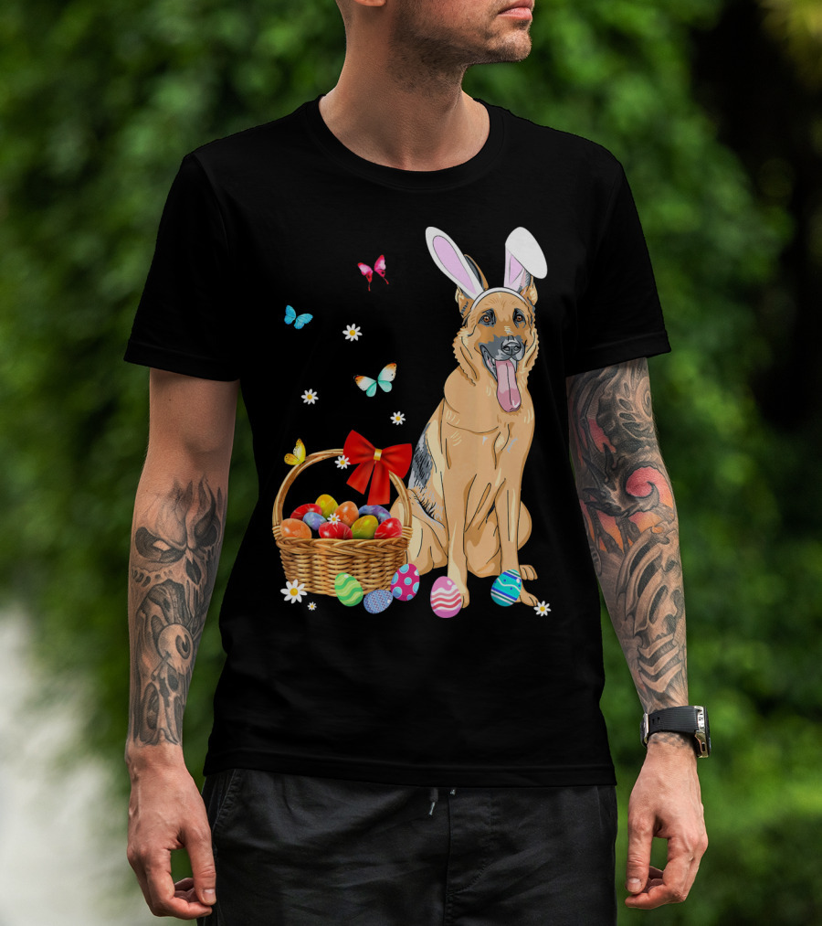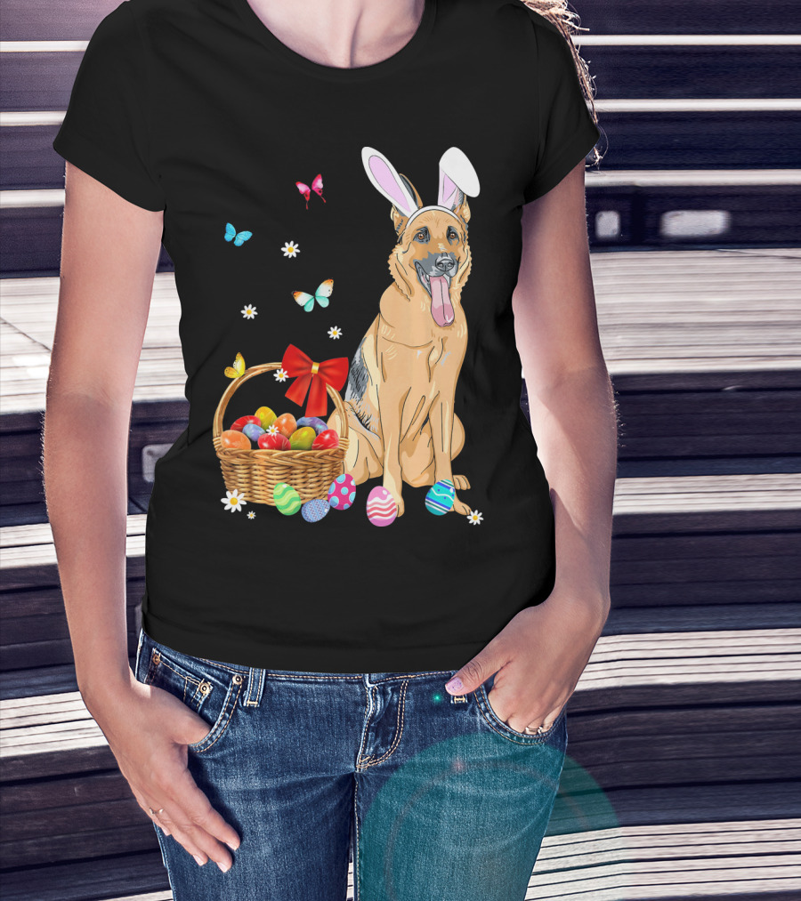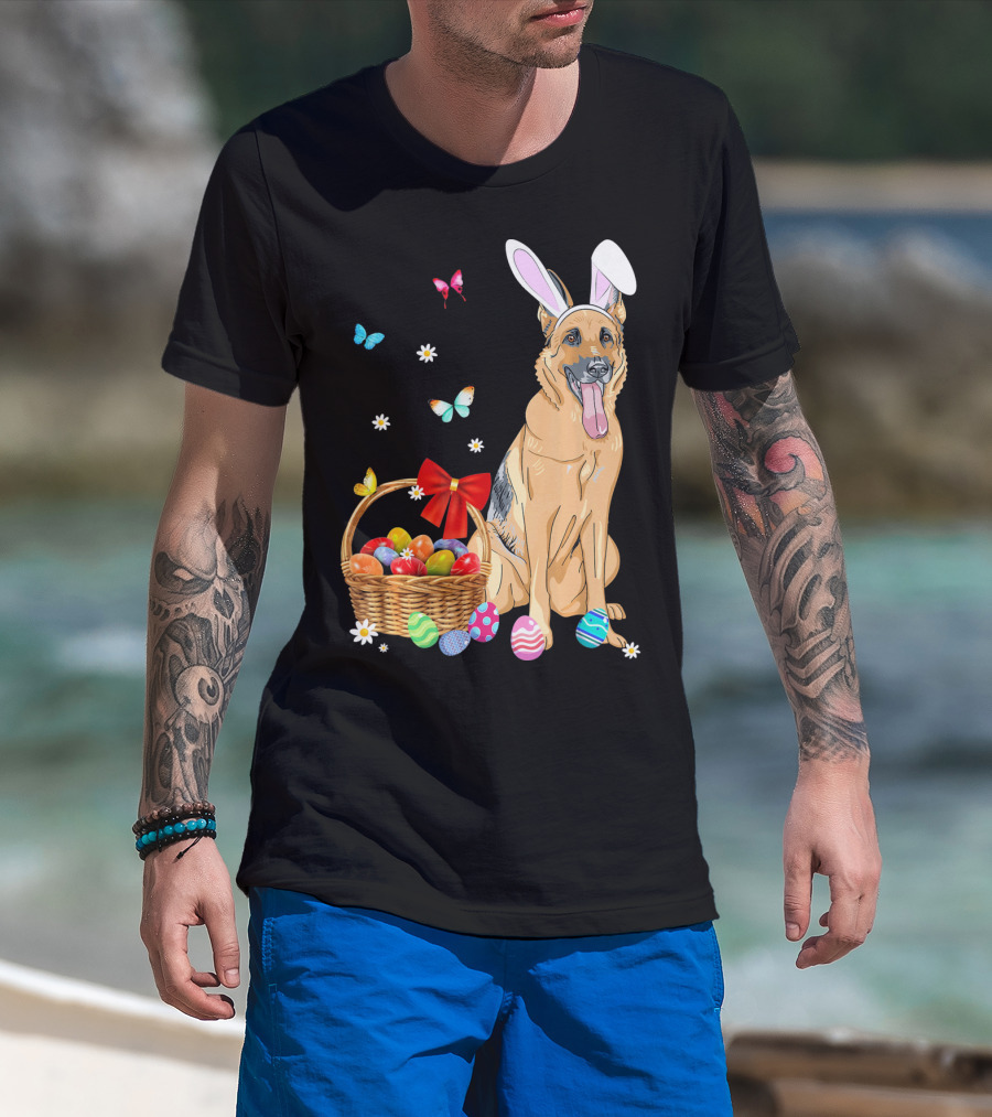 German Shepherd Bunny Ears Rabbit Easter Eggs Basket Butterflies T-Shirt