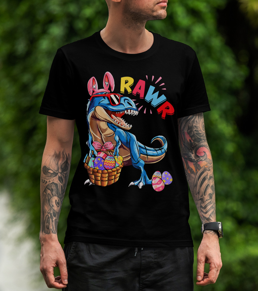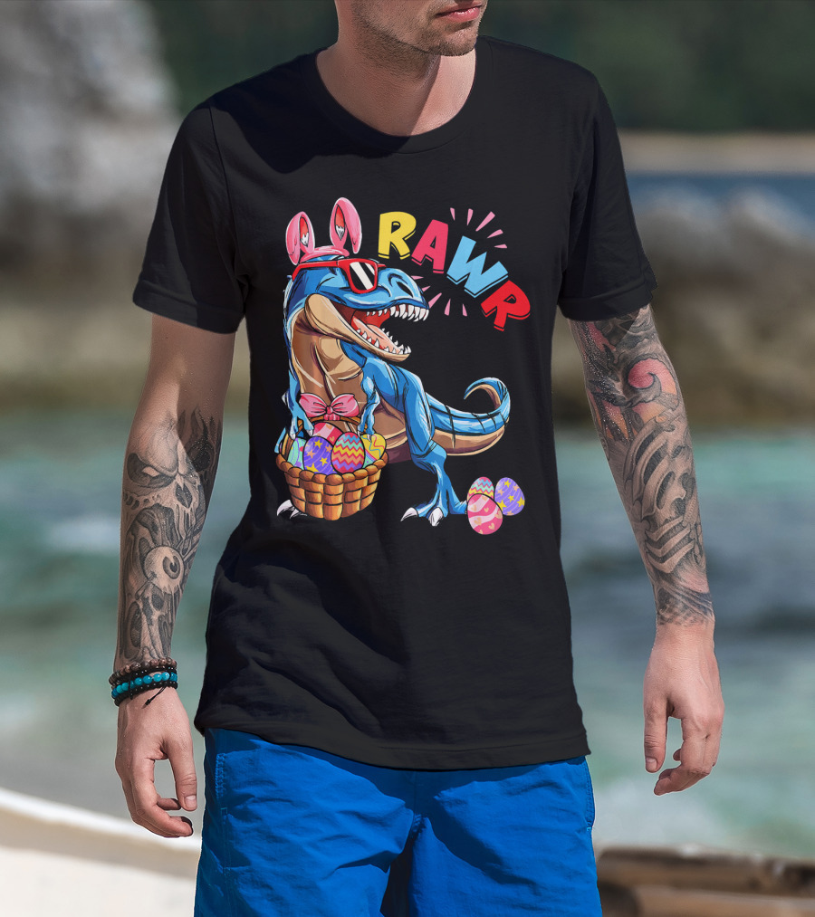 Dinosaur Easter Bunny Rex Rawr With Eggs And Basket T-Shirt