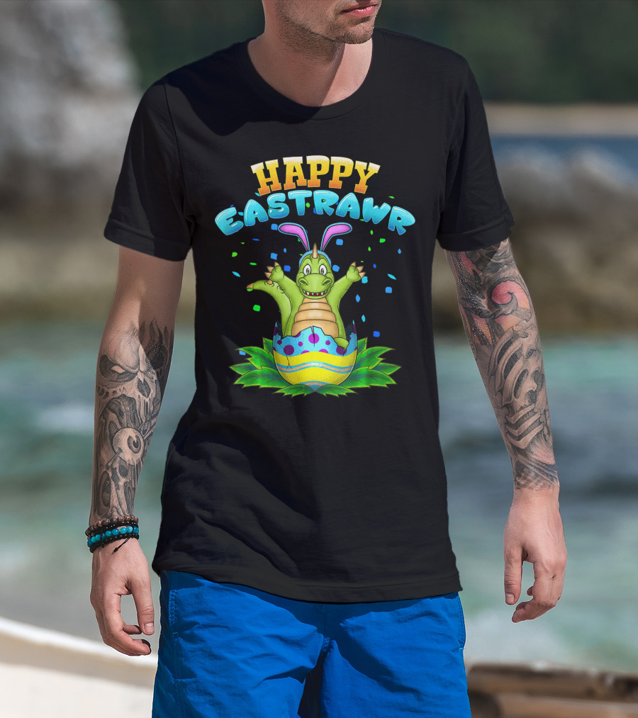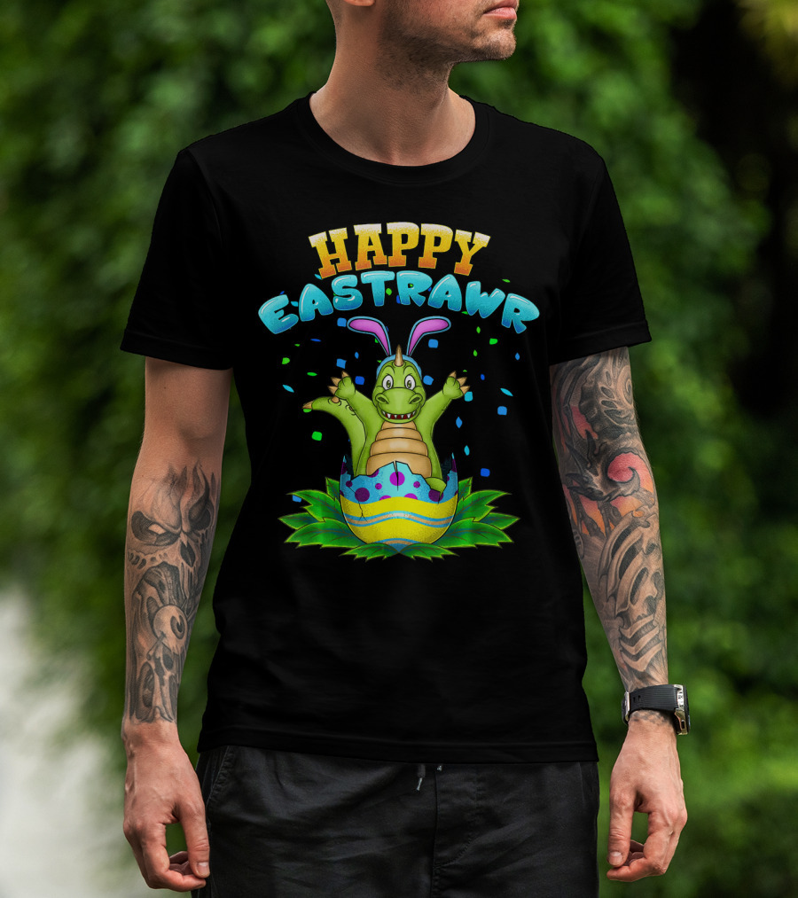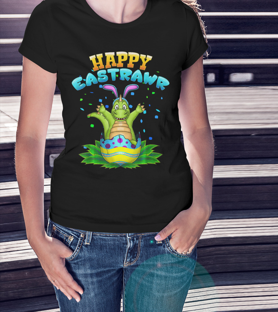 Happy Eastrawr Dinosaur In Easter Egg With Bunny Ears And Confetti T-Shirt