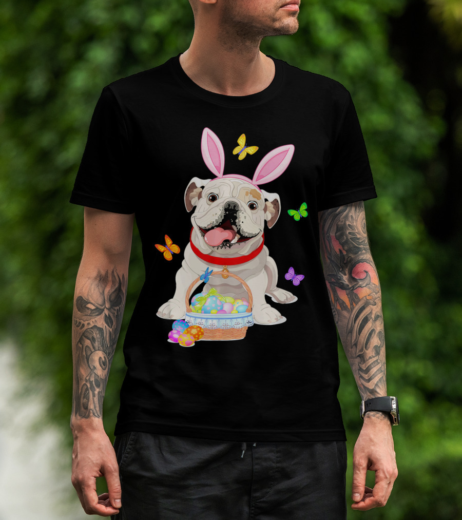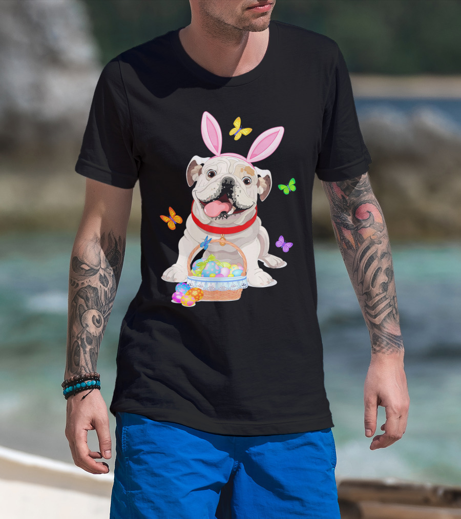 English Bulldog With Bunny Ears And Easter Egg Basket With Butterflies T-Shirt