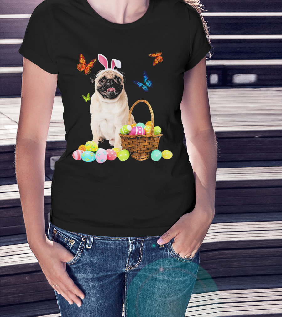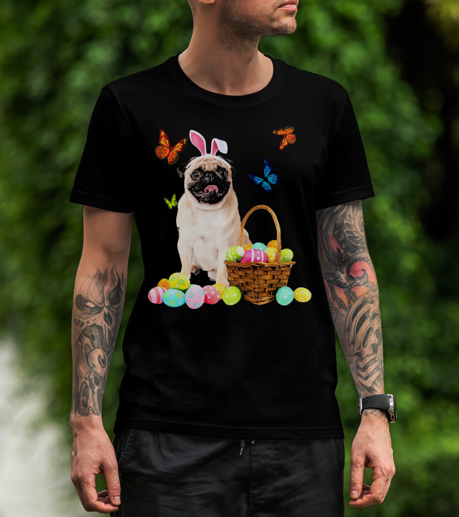 Pug With Bunny Ears And Easter Eggs With Colorful Butterflies T-Shirt