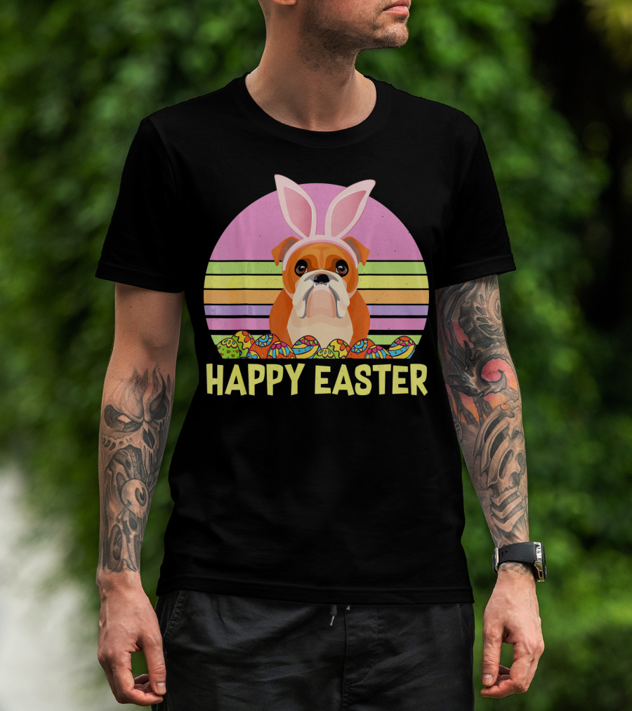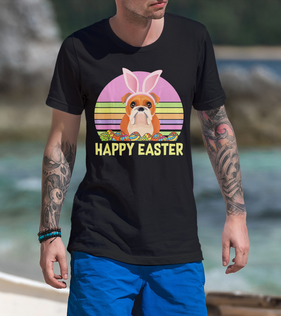 Happy Easter Day British Bulldog Bunny Ears Rainbow Eggs Retro T-Shirt