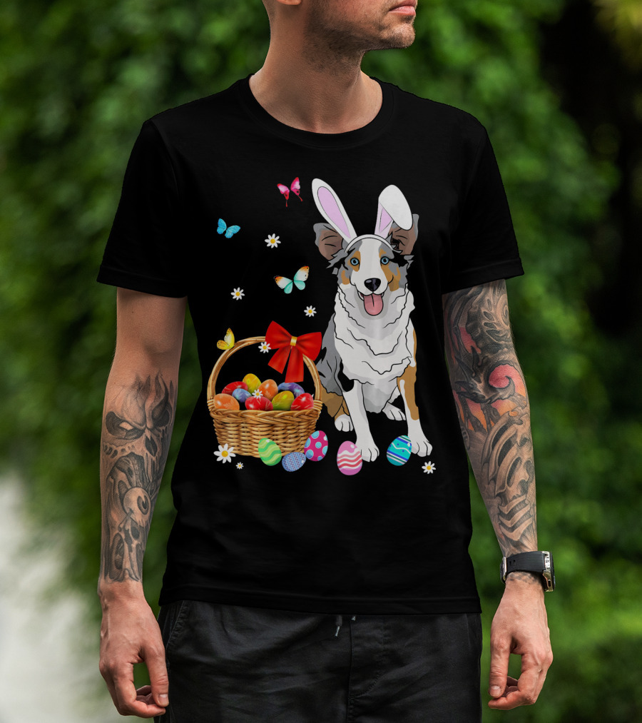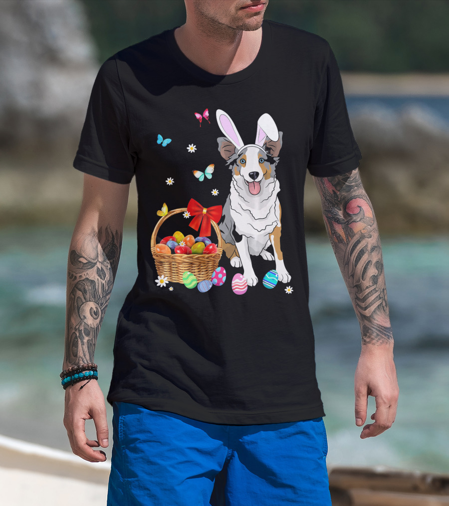 Australian Shepherd Bunny Ear Butterflies Basket Easter Egg Flowers T-Shirt