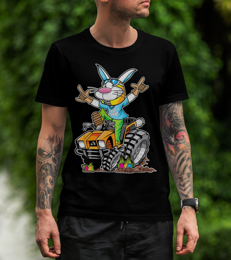 The Easter Bunny Egg Champ Riding ATV with Easter Eggs and Sunglasses T-shirt is designed for everyday wear and a consistent fit. Fabric is pre-shrunk ring-spun cotton with durable stitching. See the size chart below for exact measurements.