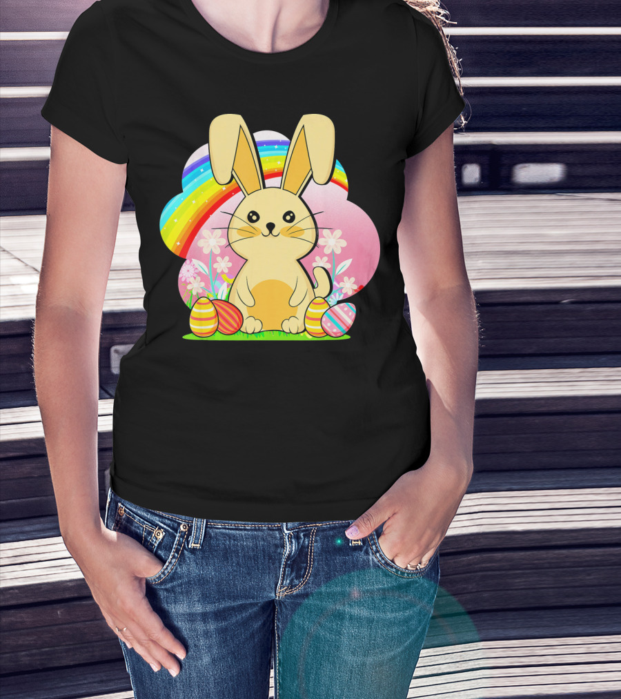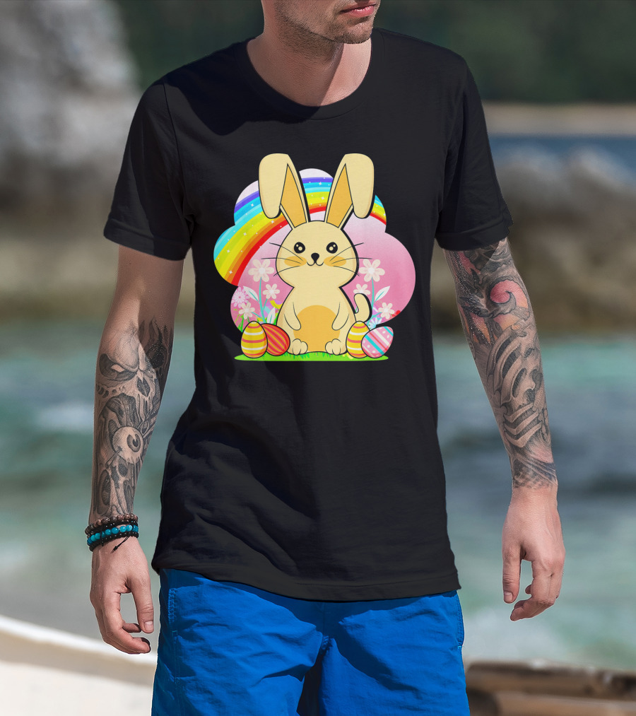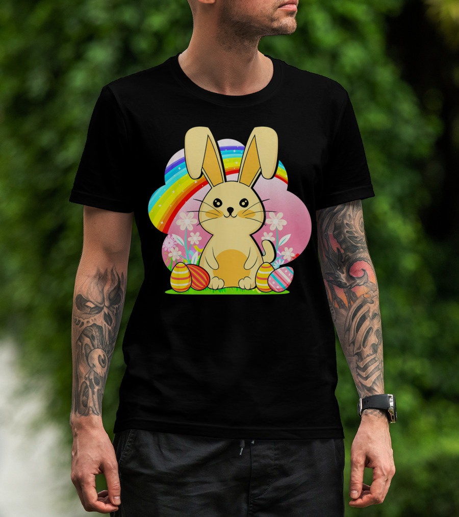 Easter Egg Bunny With Rainbow And Flowers T-Shirt