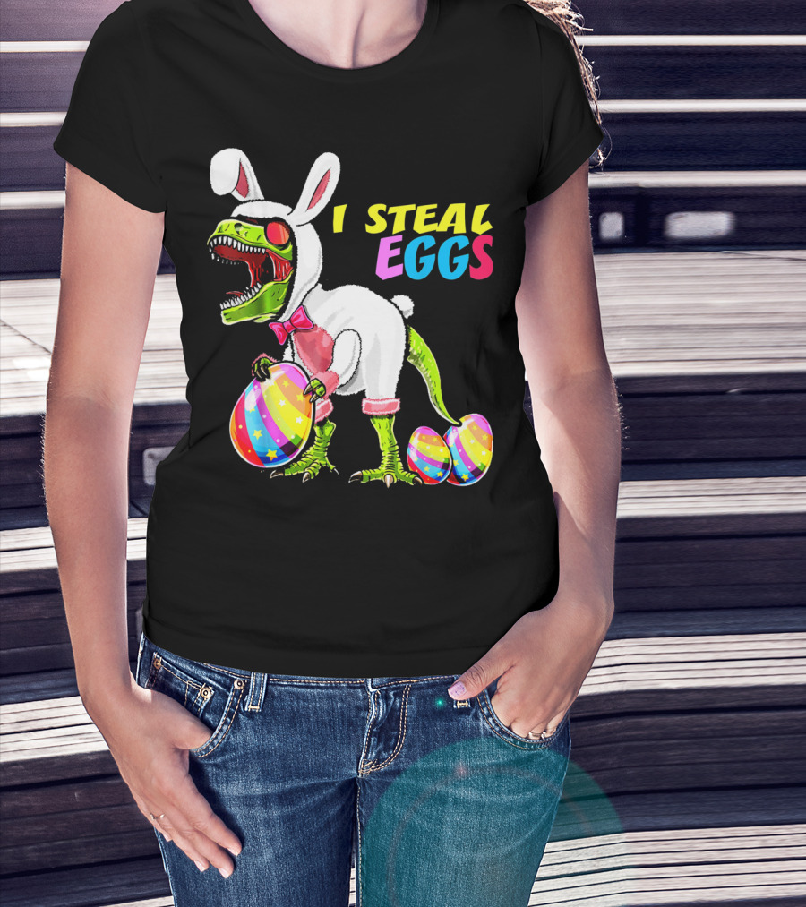 I Steal Easter Eggs Dinosaur Rex Bunny In Costume Holding Colorful Striped Eggs T-Shirt
