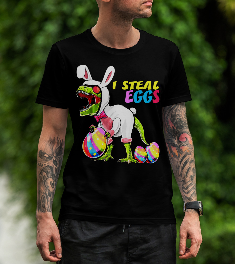 The I Steal Easter Eggs Dinosaur Rex Bunny in Costume Holding Colorful Striped Eggs T-shirt is designed for everyday wear and a consistent fit. Fabric is pre-shrunk ring-spun cotton with durable stitching. See the size chart below for exact measurements.