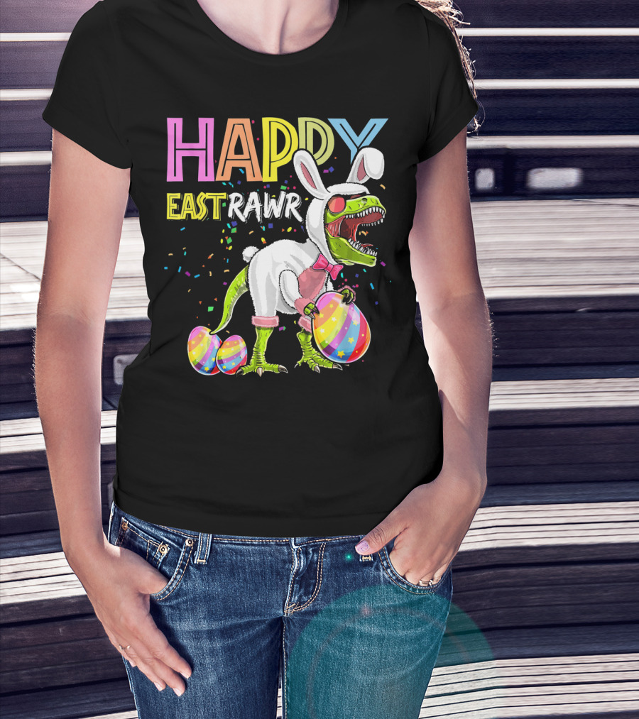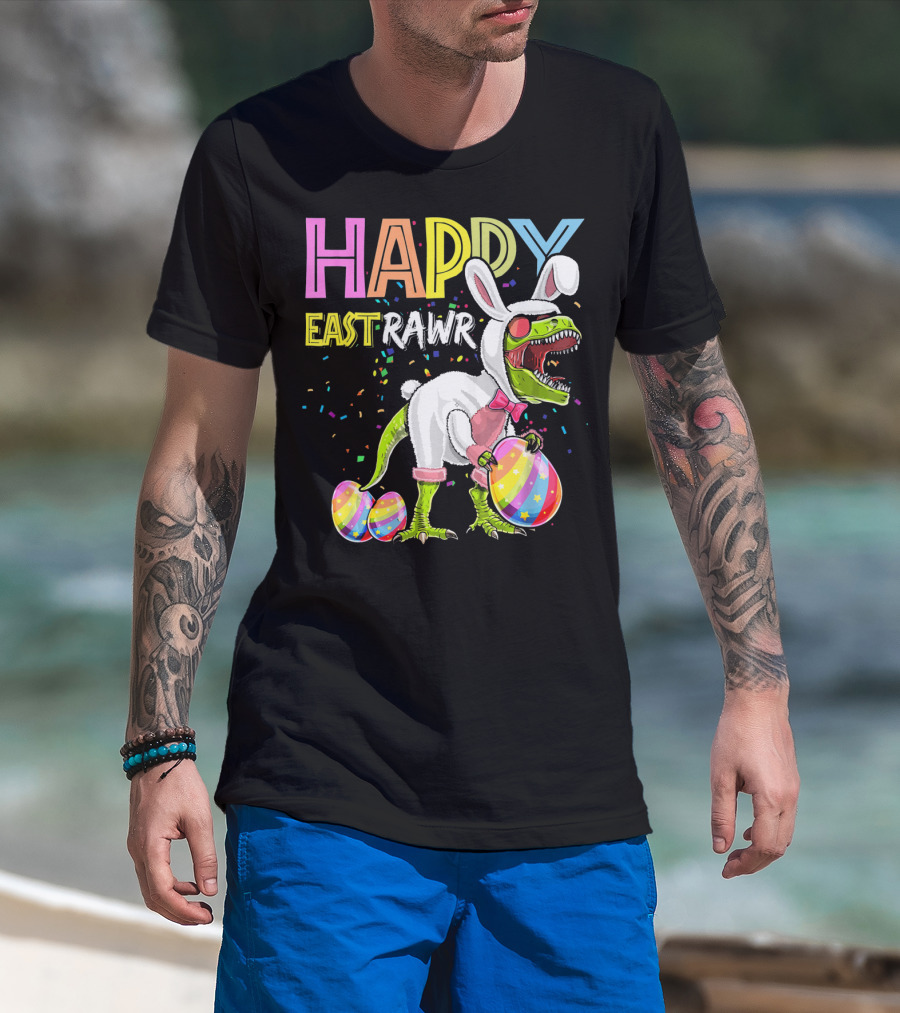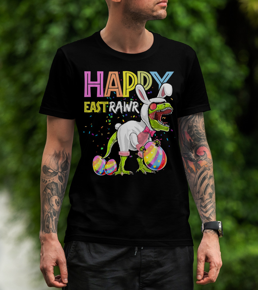 HAPPY EASTRAWR DINOSAUR BUNNY WITH EGGS AND CONFETTI T-Shirt