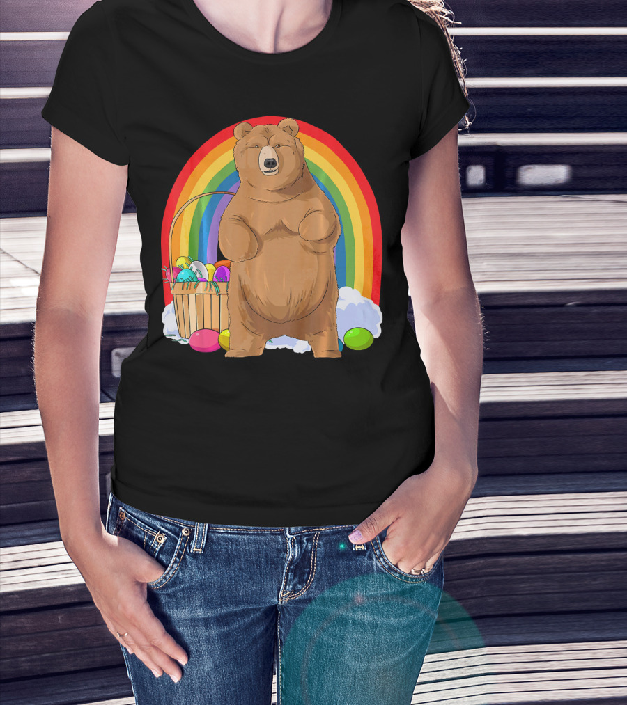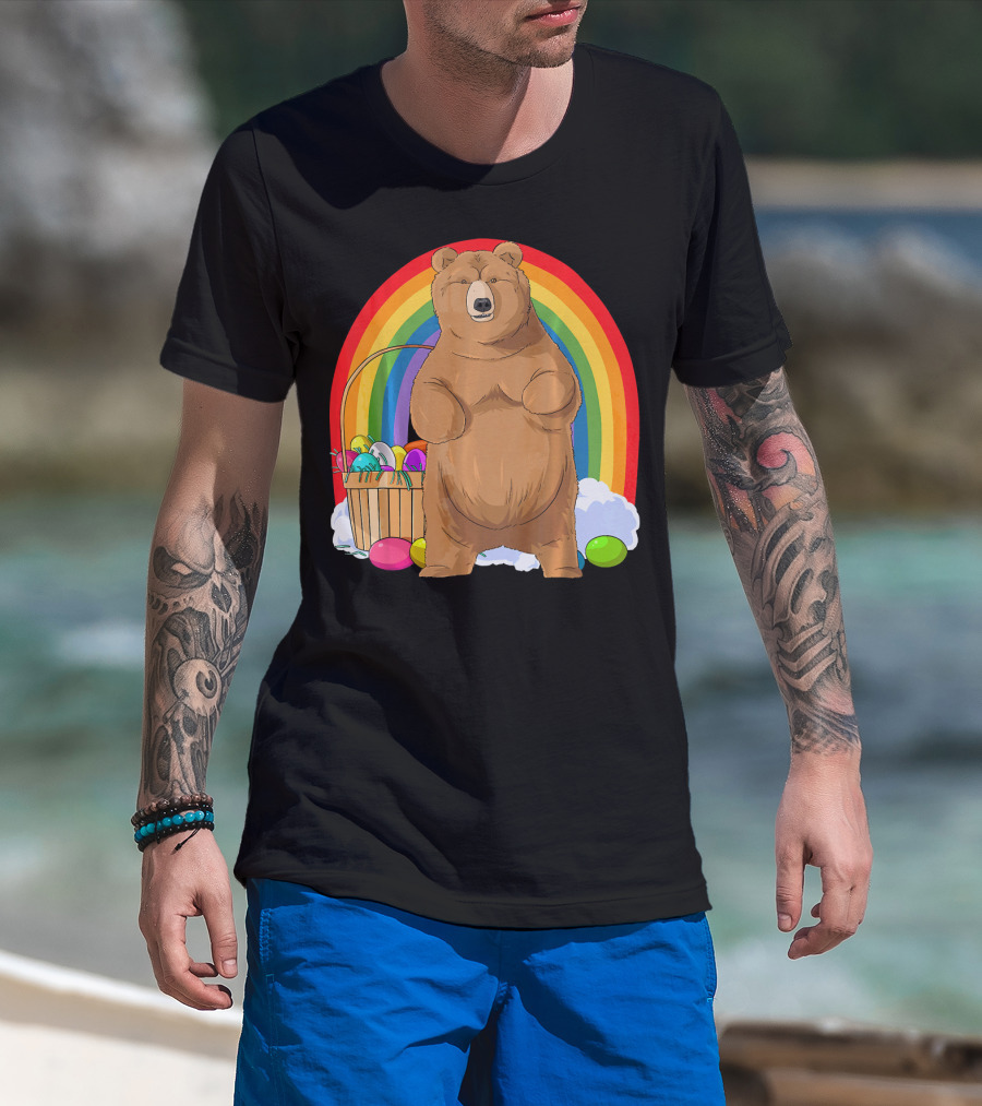 Bear With Easter Egg Basket And Rainbow Background T-Shirt