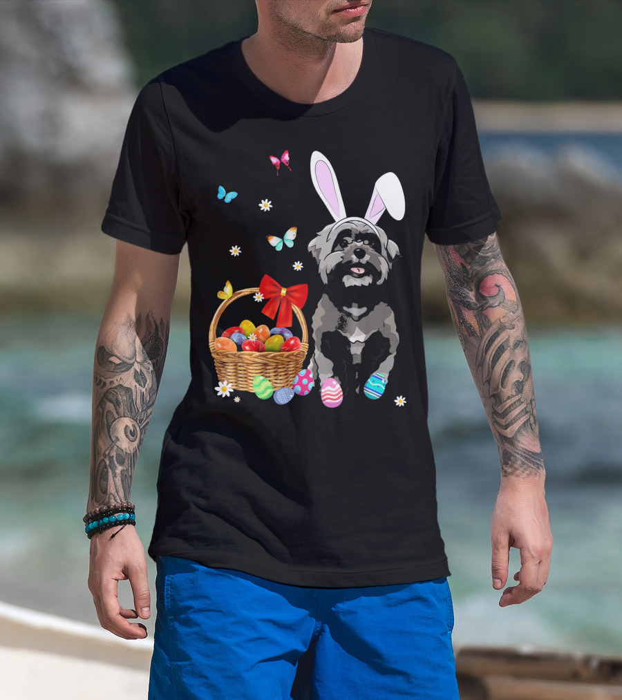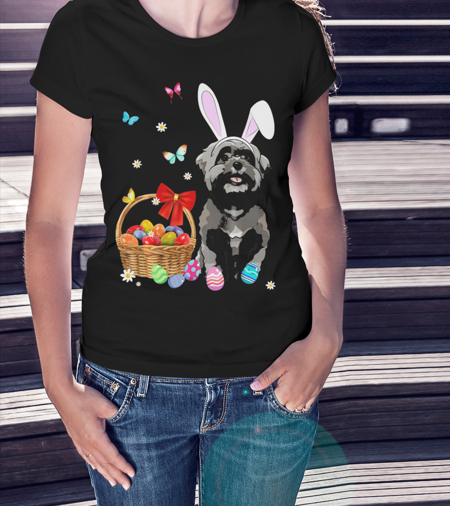 Shih Tzu With Bunny Ears And Easter Egg Basket With Butterflies And Flowers T-Shirt
