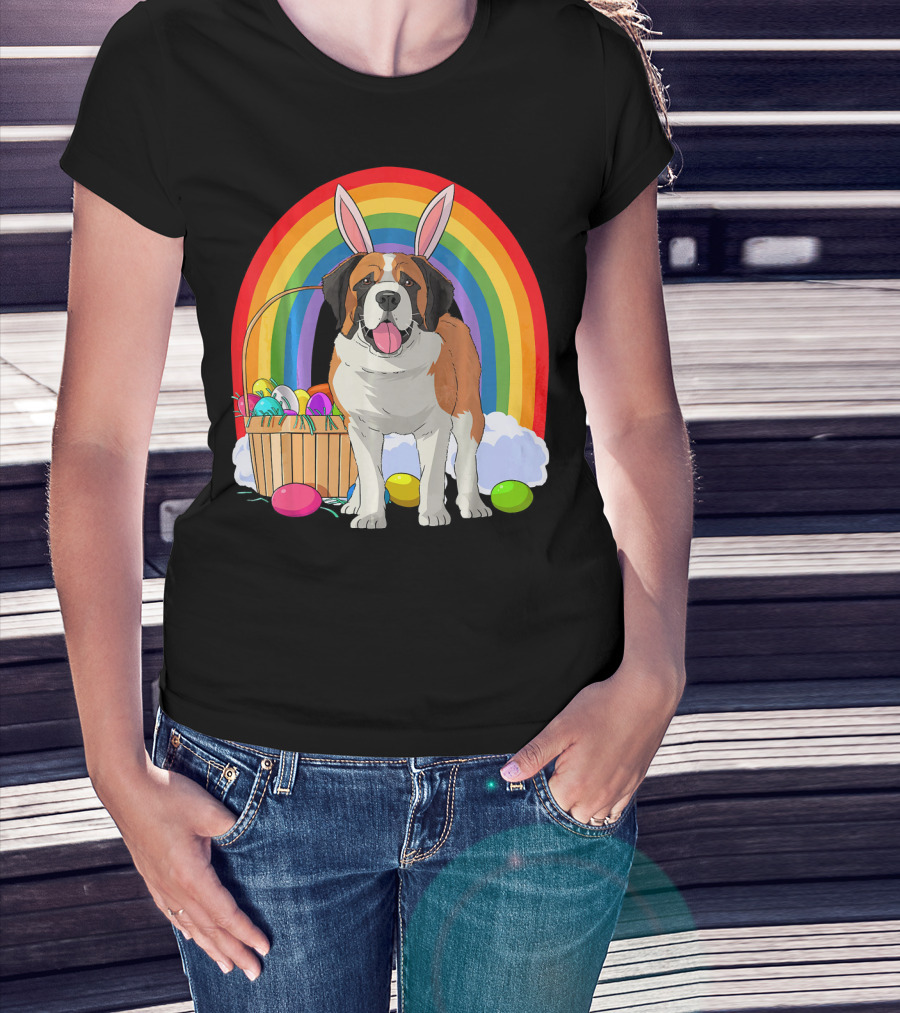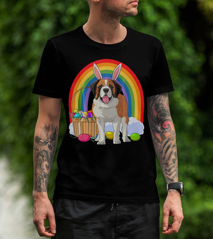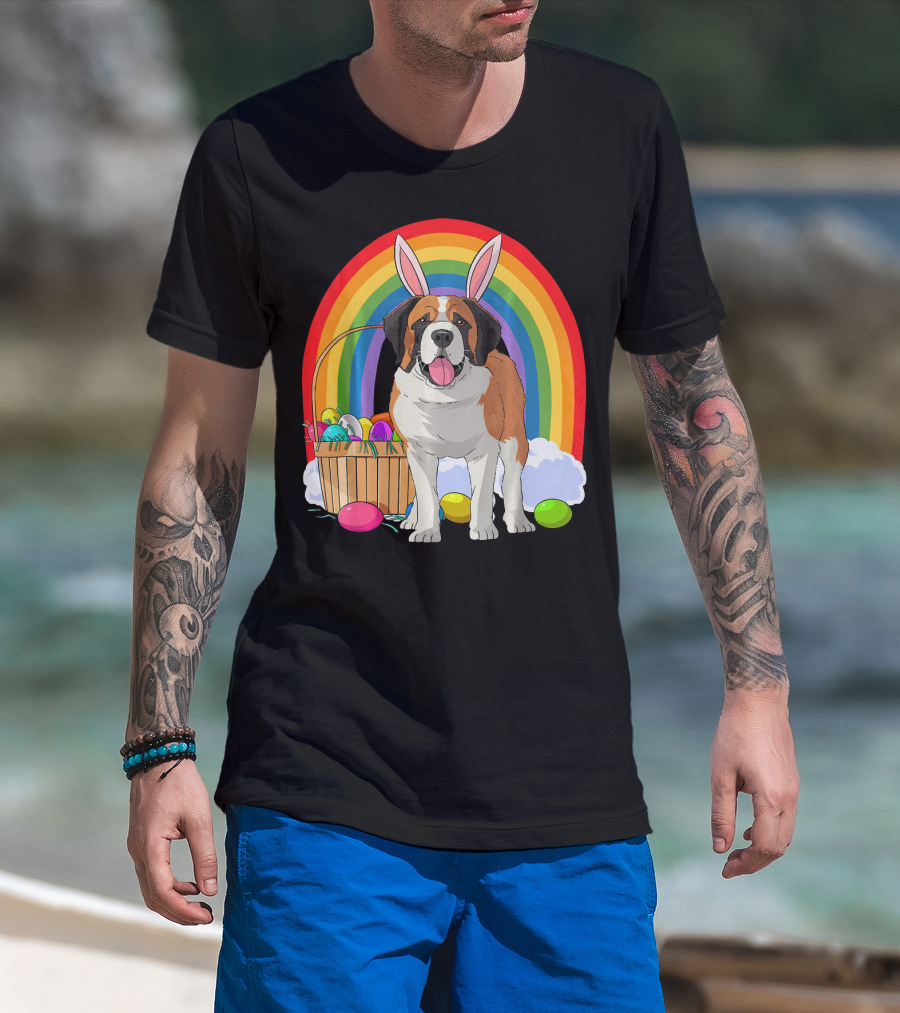 Saint Bernard Bunny Dog With Easter Eggs And Rainbow T-Shirt