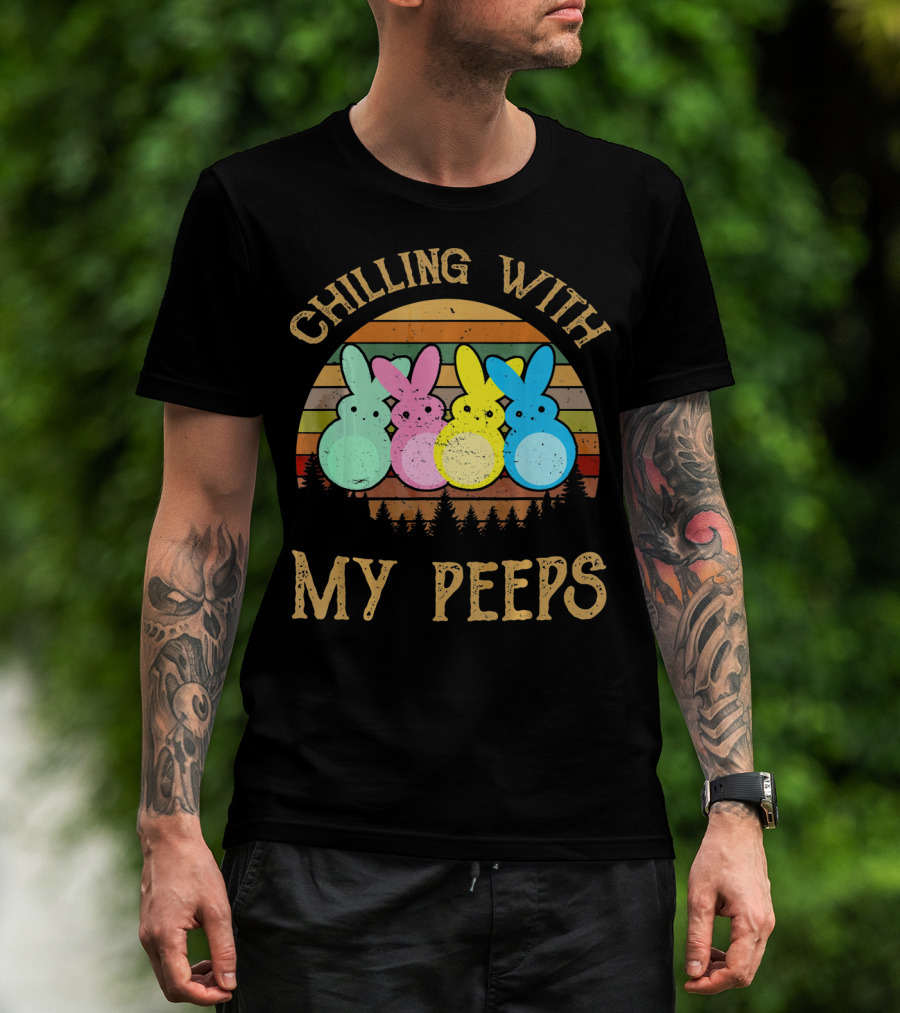 The CHILLING WITH MY PEEPS VINTAGE EASTER BUN BUNNIES RETRO SUNSET STRIPES T-shirt is designed for everyday wear and a consistent fit. Fabric is pre-shrunk ring-spun cotton with durable stitching. See the size chart below for exact measurements.