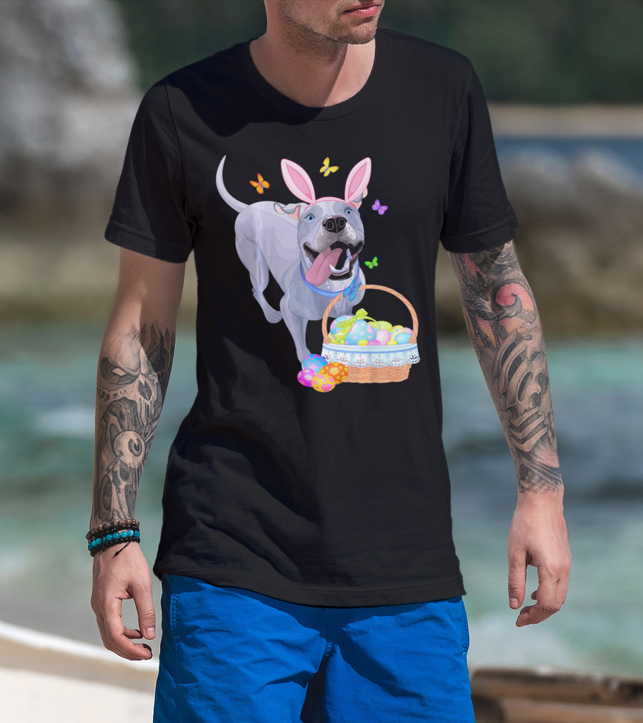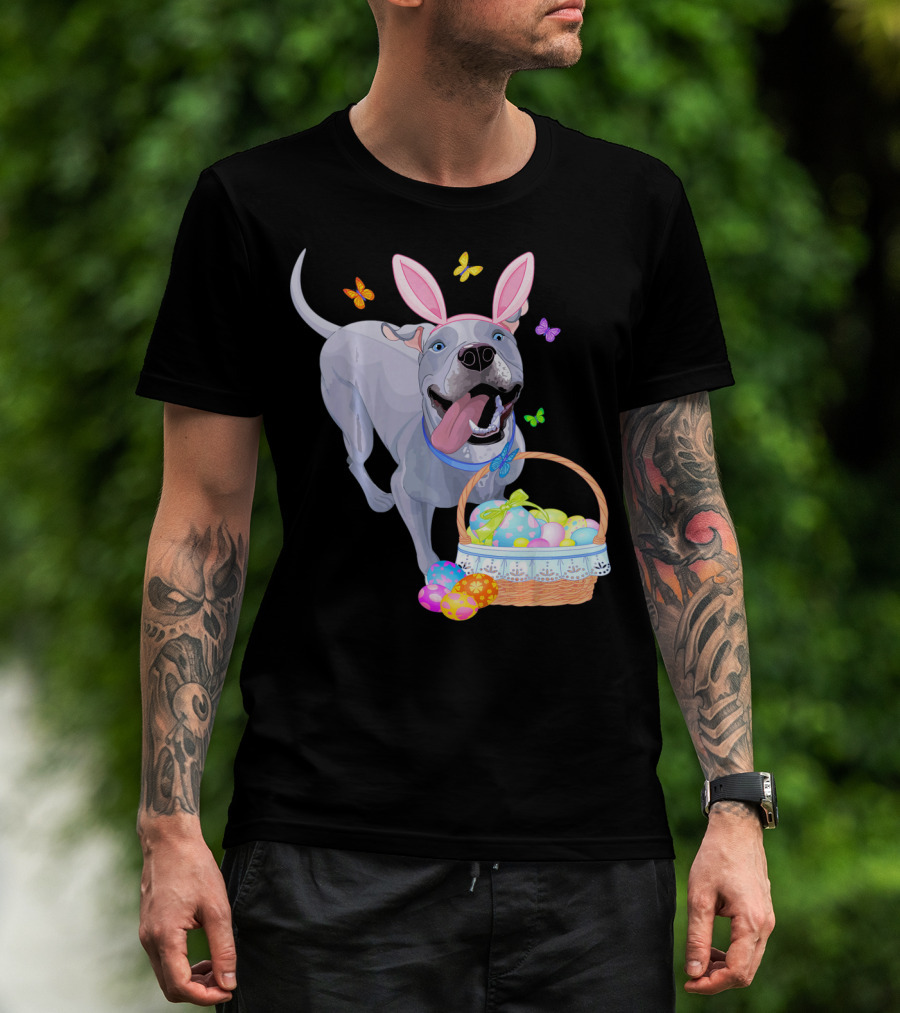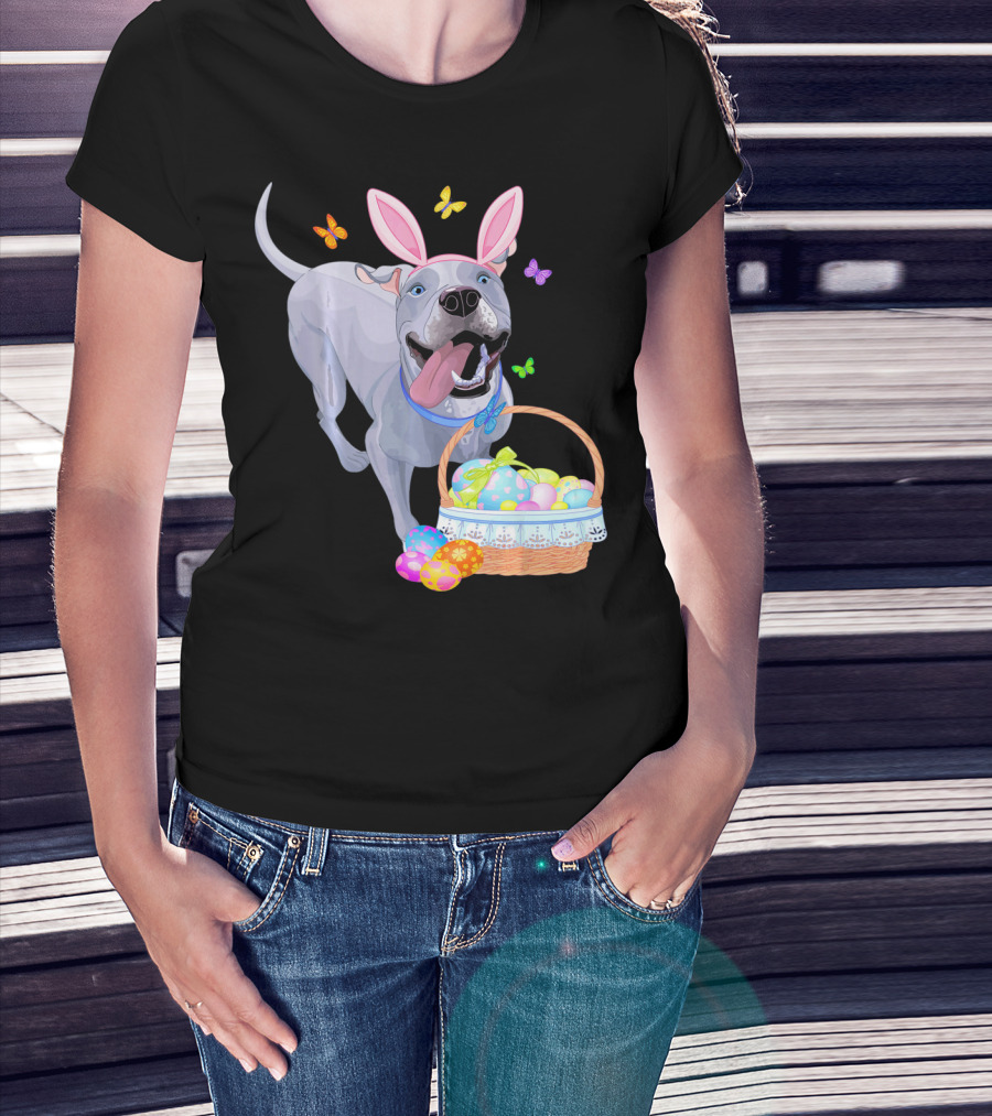 Gray Pit Bull Puppy With Bunny Ears And Easter Basket T-Shirt