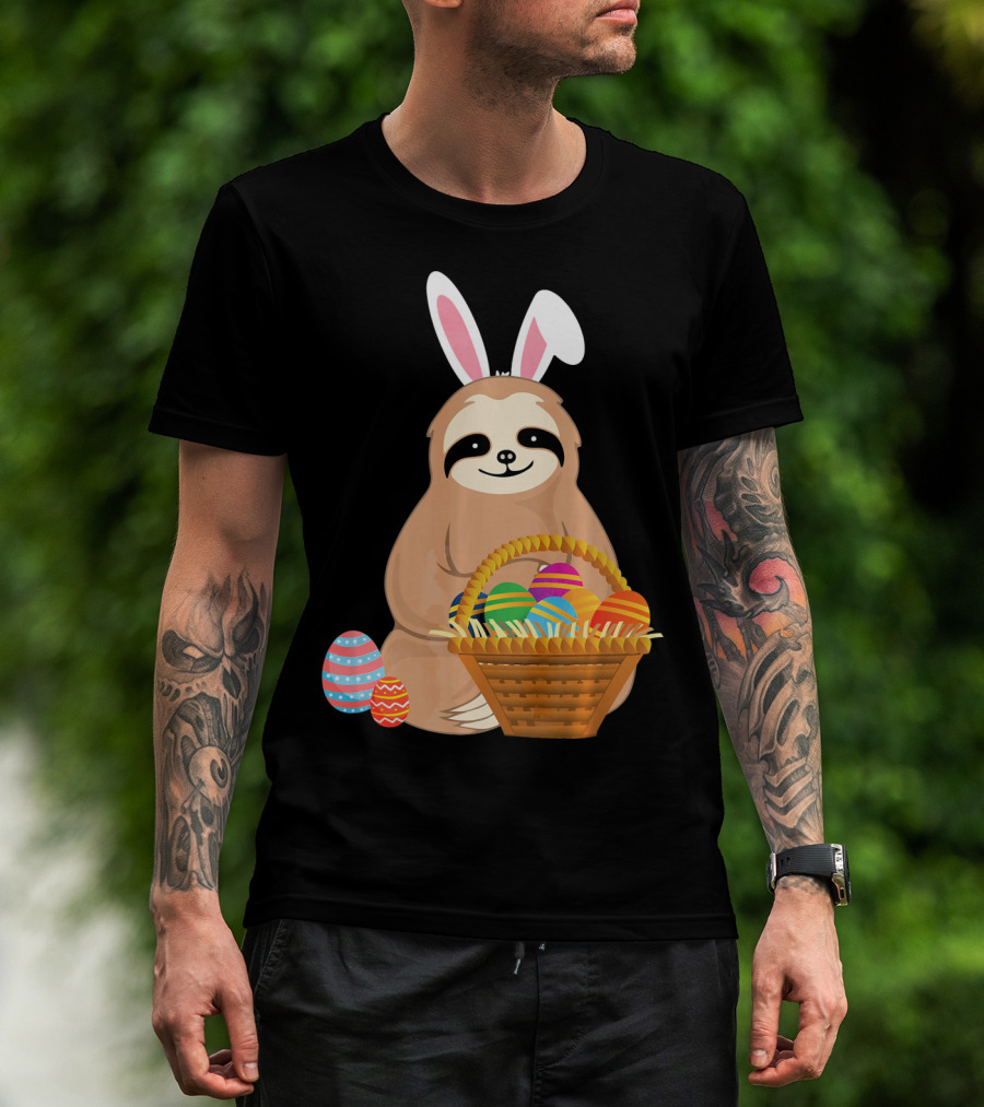 Easter Sloth Bunny With Colorful Eggs Basket T-Shirt