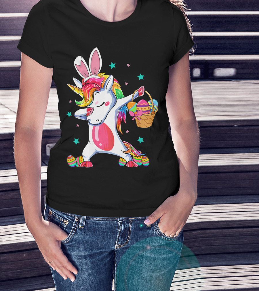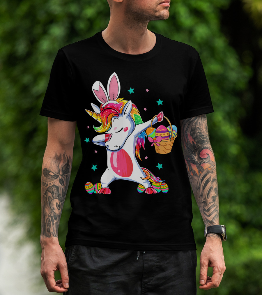 The Dabbing Bunny Unicorn with Easter Basket and Eggs Funny Easter Day T-shirt is designed for everyday wear and a consistent fit. Fabric is pre-shrunk ring-spun cotton with durable stitching. See the size chart below for exact measurements.