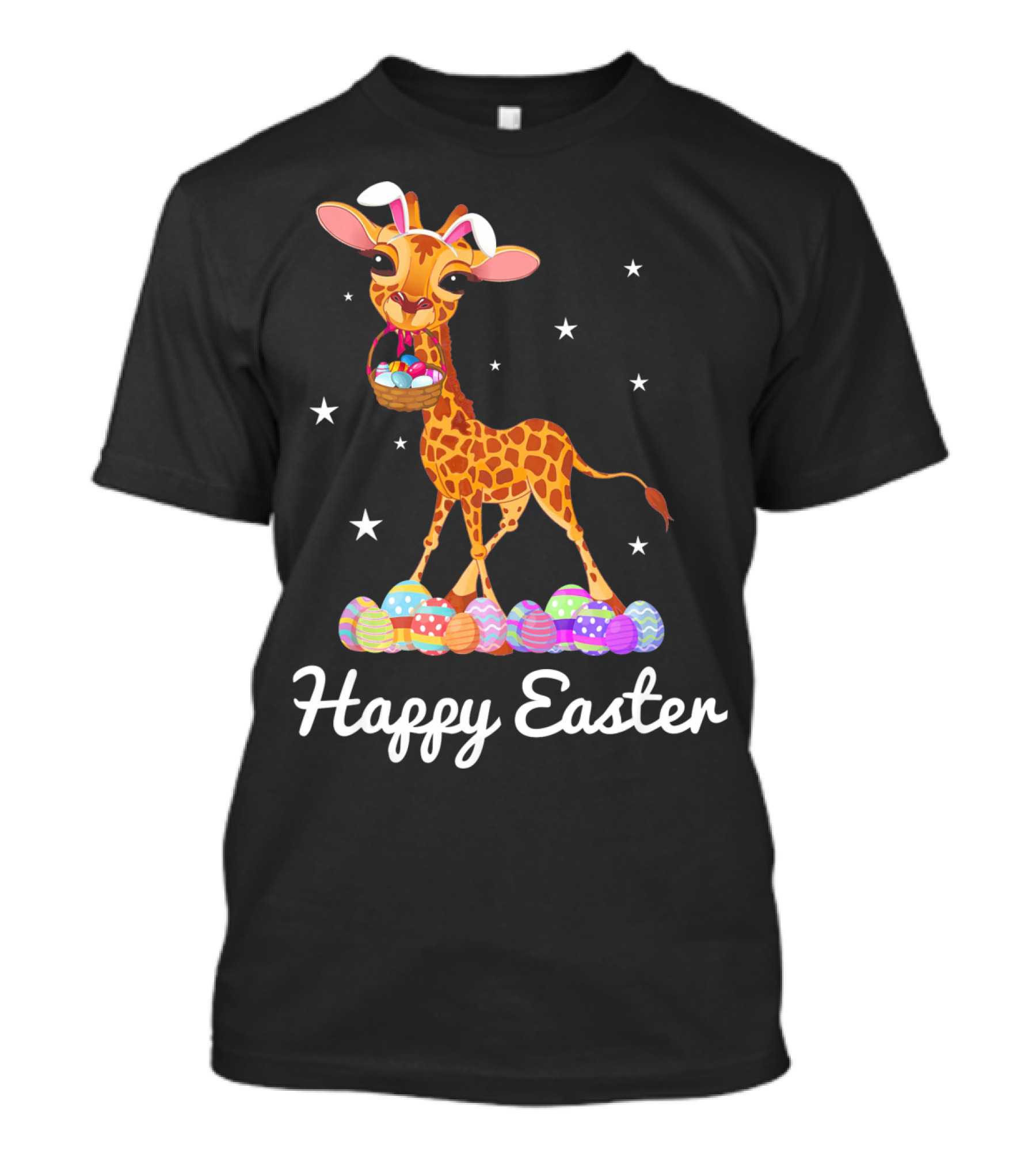 The Happy Easter Giraffe with Bunny Ears and Colorful Eggs T-shirt is designed for everyday wear and a consistent fit. Fabric is pre-shrunk ring-spun cotton with durable stitching. See the size chart below for exact measurements.