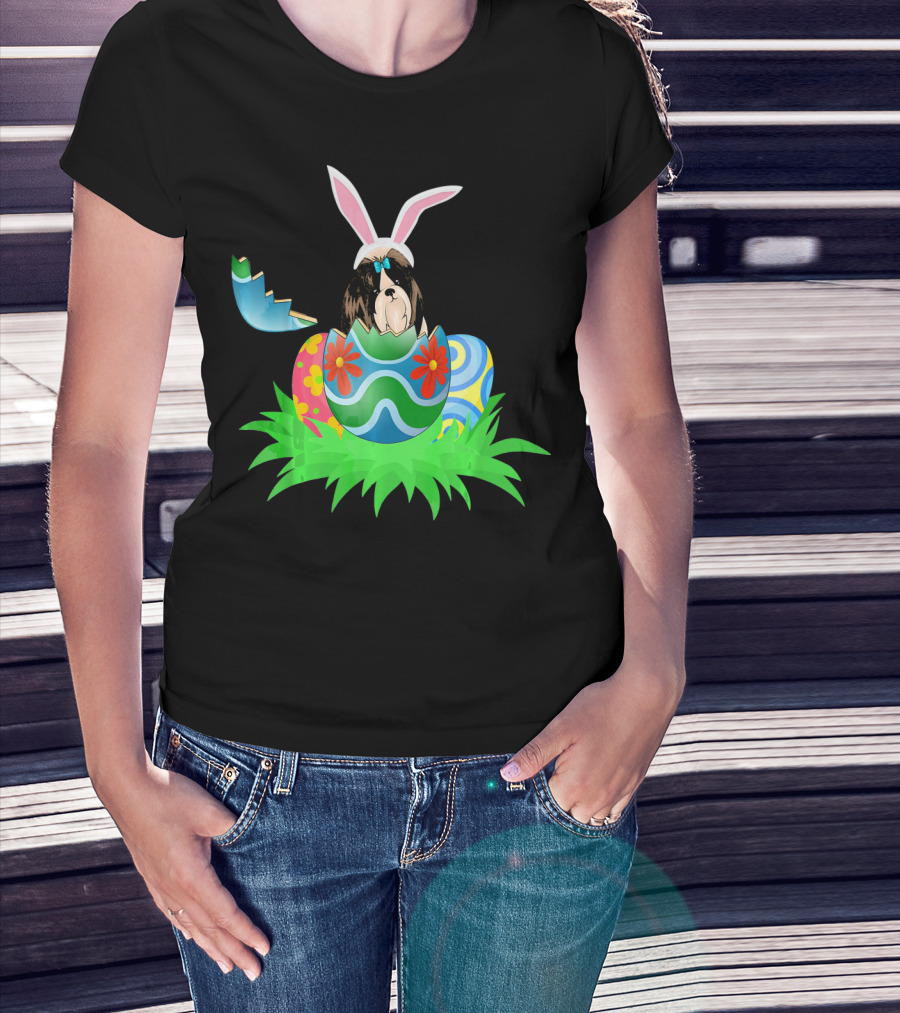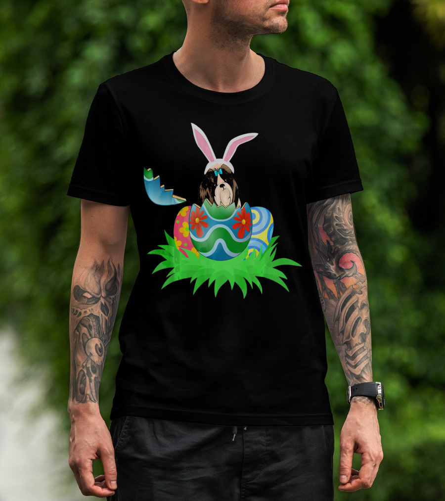 Easter Shih Tzu In Bunny Ears With Colorful Easter Eggs In Grass T-Shirt