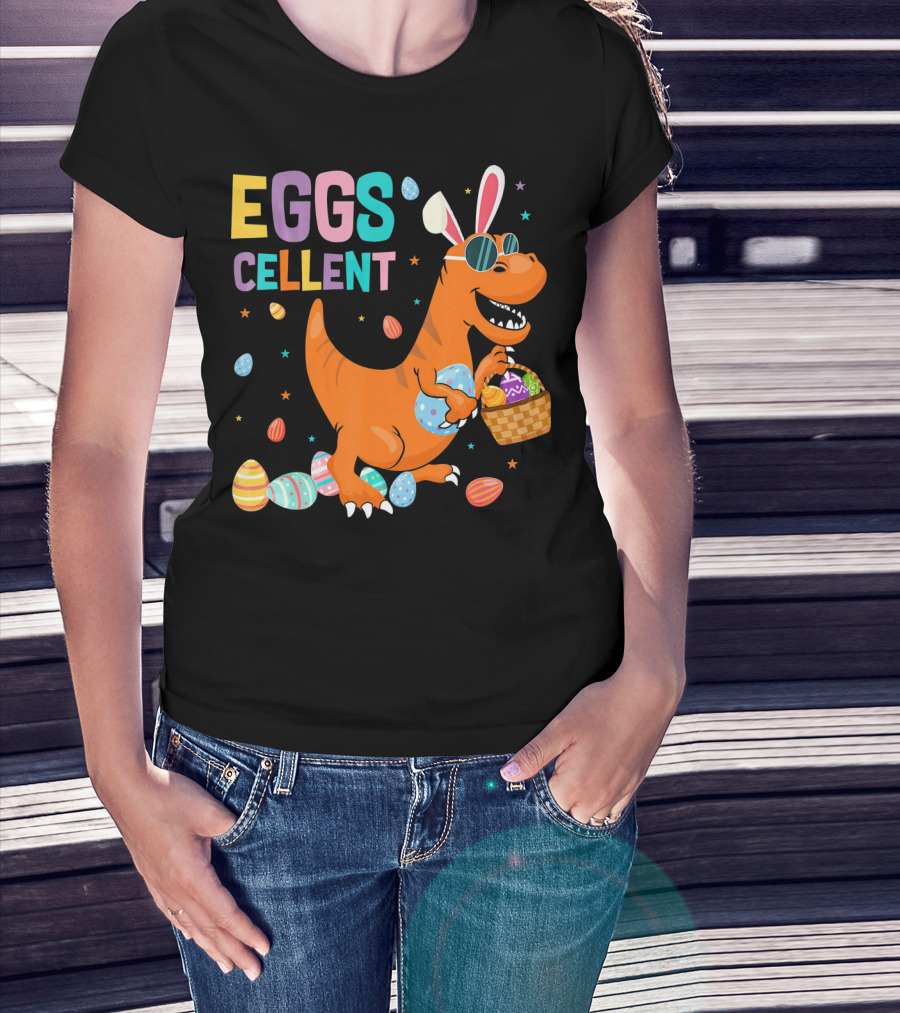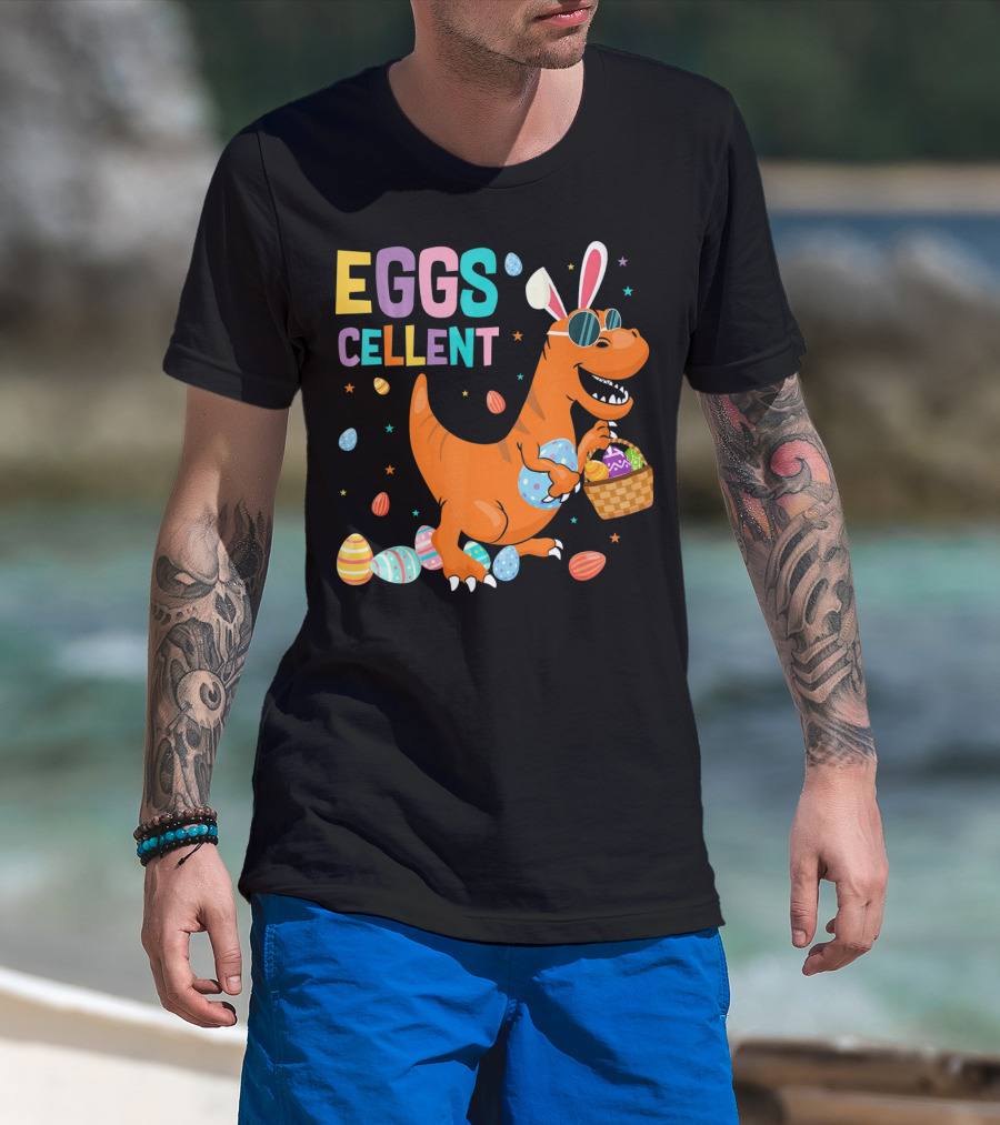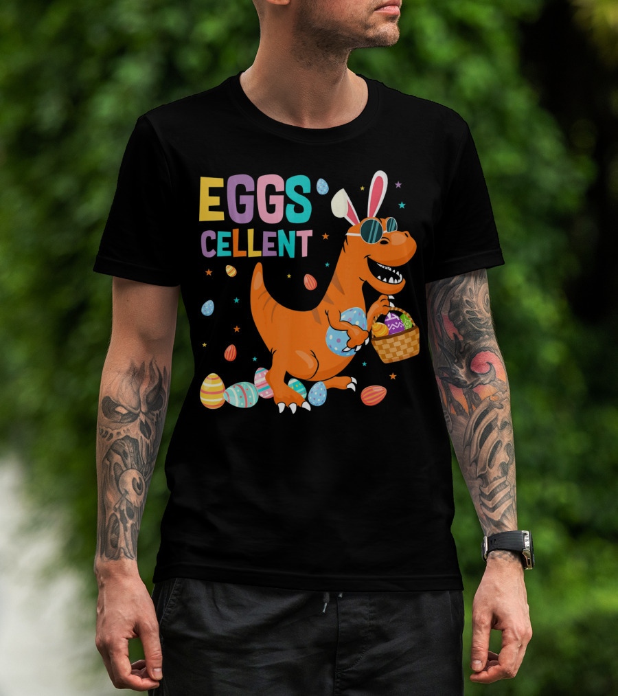 Eggscellent Easter Dinosaur With Bunny Ears And Eggs Basket T-Shirt