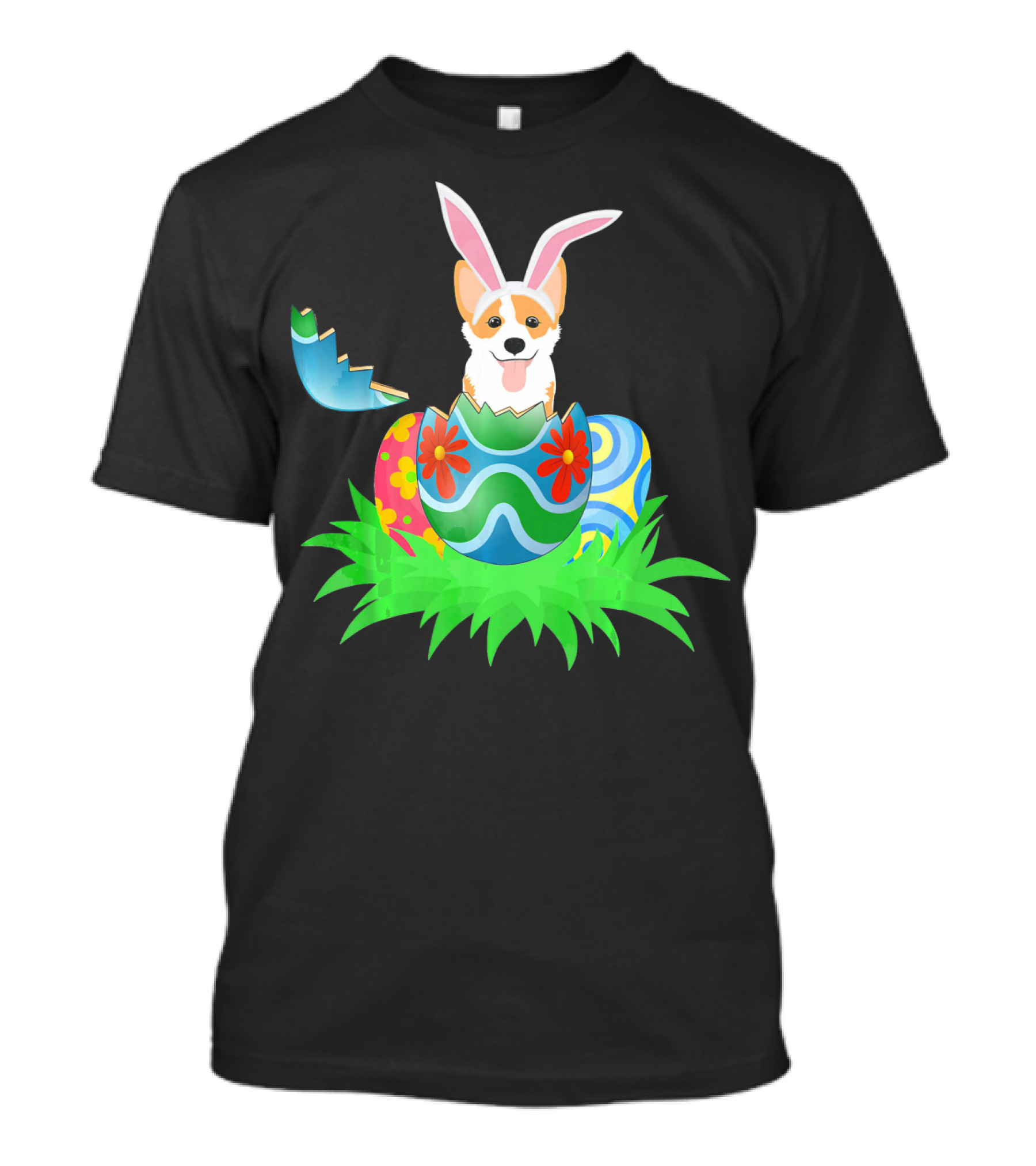 The Easter Corgi Bunny with Colorful Easter Egg Hunt T-shirt is designed for everyday wear and a consistent fit. Fabric is pre-shrunk ring-spun cotton with durable stitching. See the size chart below for exact measurements.