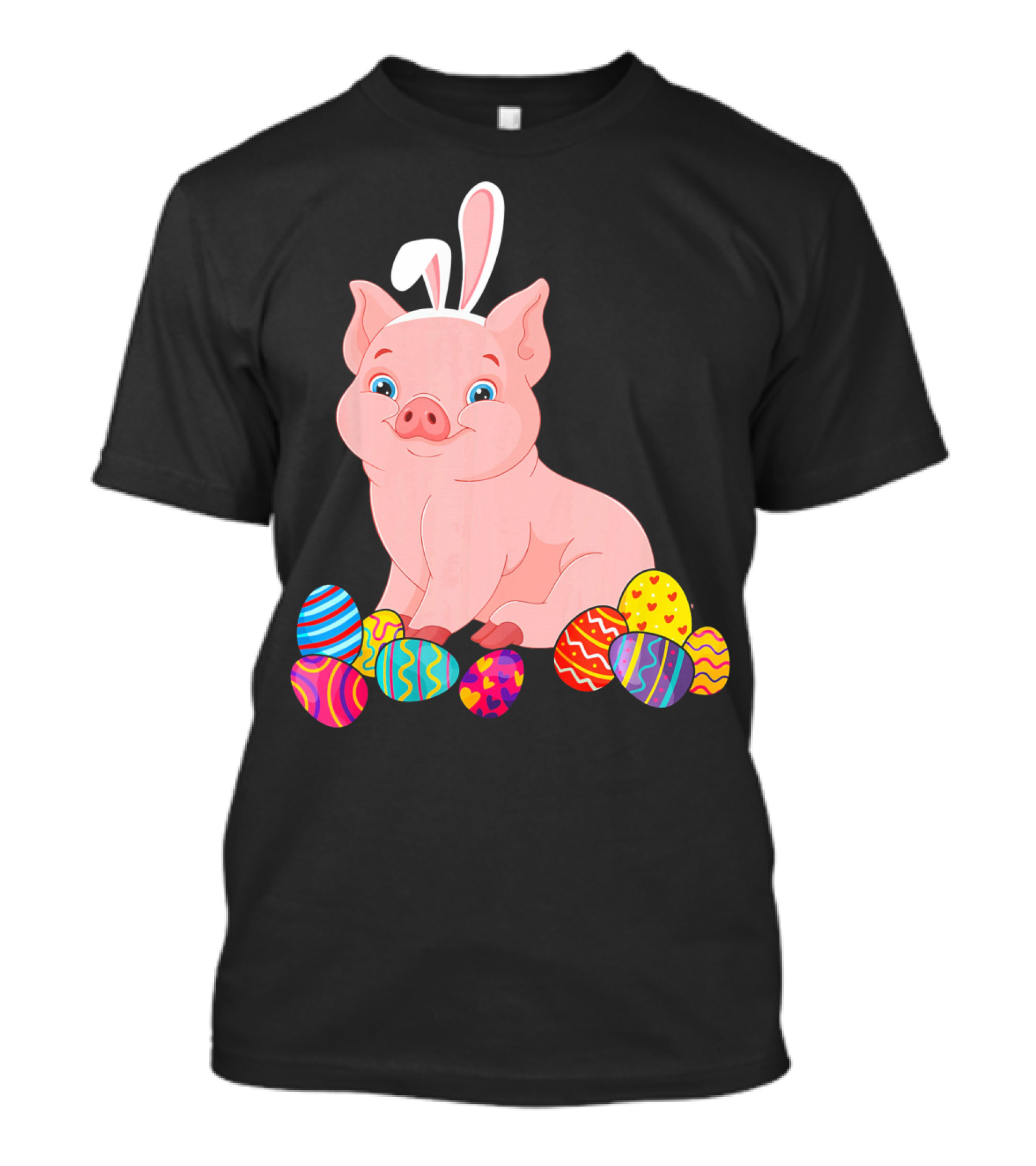 The Pig with Bunny Ears Surrounded by Colorful Easter Eggs Easter Day T-shirt is designed for everyday wear and a consistent fit. Fabric is pre-shrunk ring-spun cotton with durable stitching. See the size chart below for exact measurements.